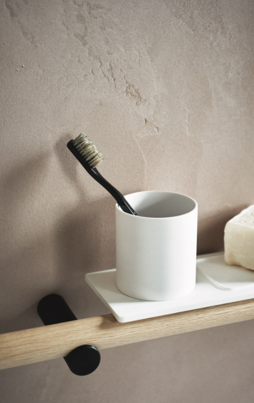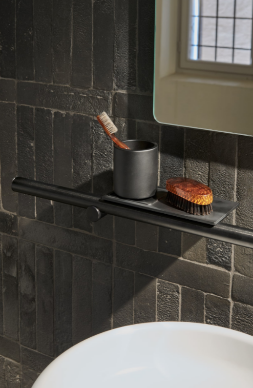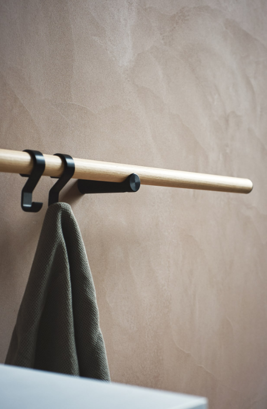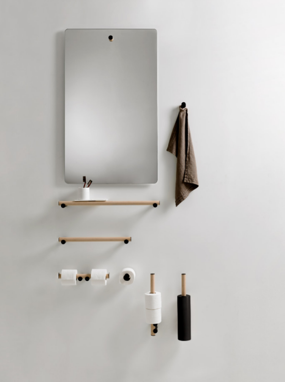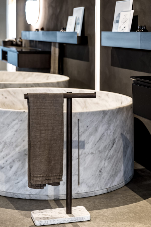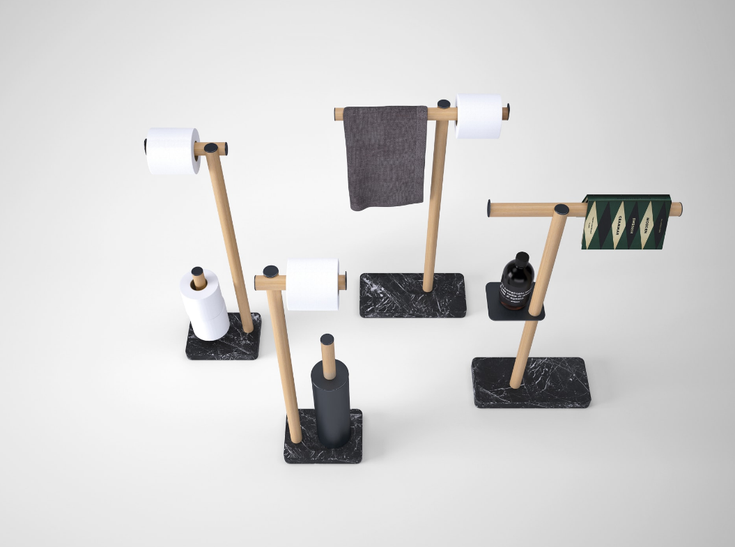 Accessories made of tubular aluminium consisting of brackets (dot) supporting a bar (line) with brushed black anodized finish or with natural, brown, dark oak veneer and a marble based for the floor standing elements. In addition to each single item it is possible to obtain a continuous bar that performs the various functions. Both the individual items and the continuous bar can be fitted with shelves, hooks or glasses in aluminium freely positionable along its entire length. The successful Dot Line series is enriched with a new addition for independent use that can also be placed outside the bathroom. An interplay of essential lines for a versatile object, equipped with lighting thanks to the LED strip in the underlying surface of the superior bar.