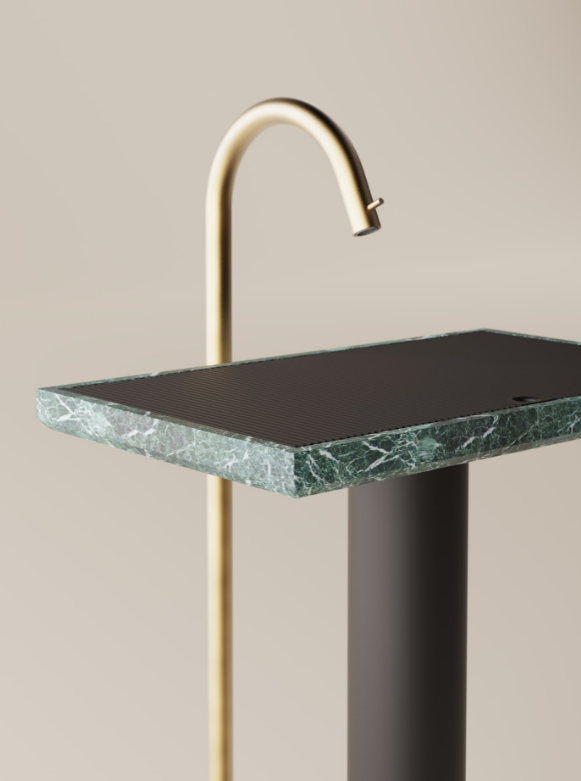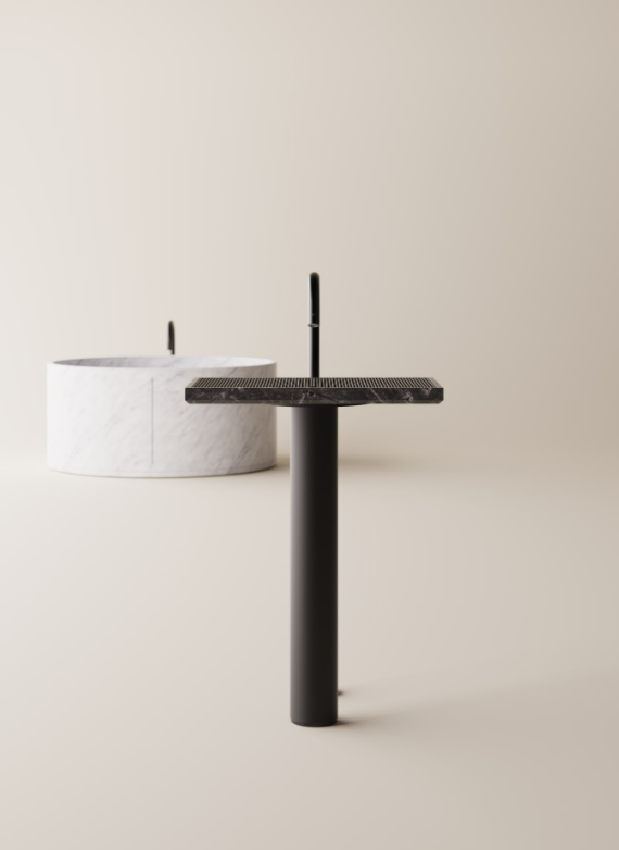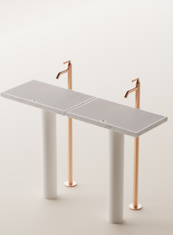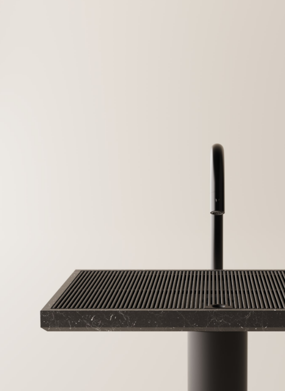 The washbasin in the “Ell” series is an iconic but lightweight piece. The flat surface with its breakwater-grill is also the basin, and the two become a single element. Today, in a simultaneously creative and rigorous sequence, the investigation arrives at the pure essence of the washbasin. Two simple architectural elements that radicalize functions.