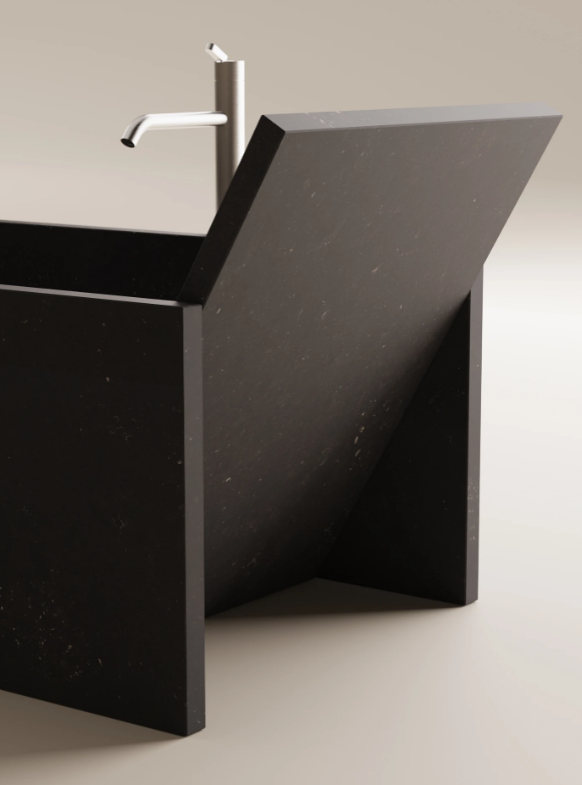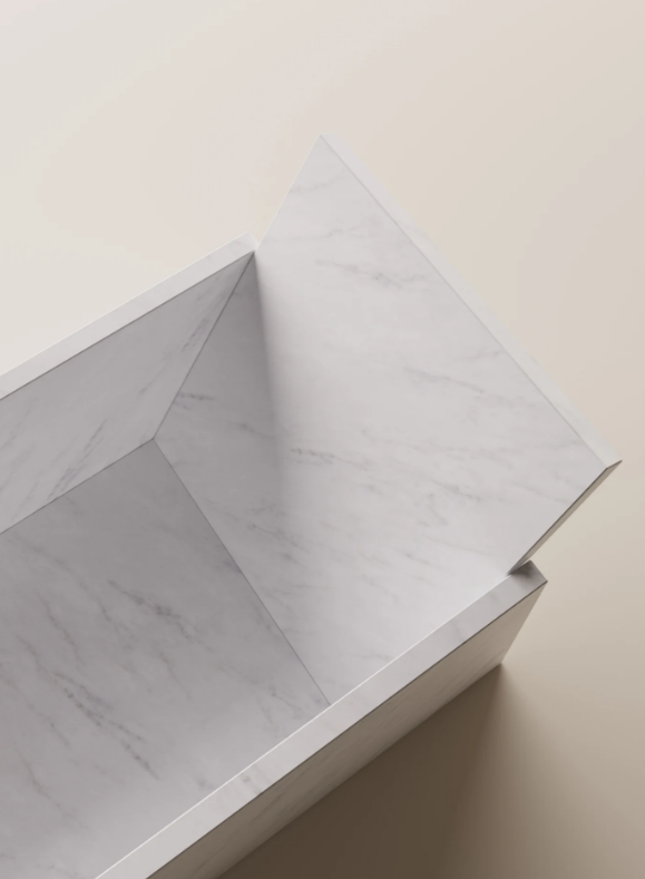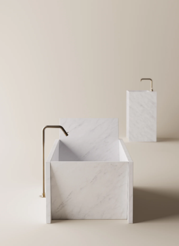 Together with the washbasin of the same name, the new bathtub of architectural marks launches the collaboration between Agape and the French architect. Thanks to an ingenious system of invisible joints in the construction of the bathtub the surfaces appear to simply approach one another side by side. The surfaces brush gently against one another, and thanks to the extremely precise inclination of the panels that become the backrests, the bathtub is transformed into a cozy nest where you can sit, stretch out, read, and relax. Like the washbasin, this piece is an abstract object that uses contrast to enhance the almost baroque splendor of the marble.