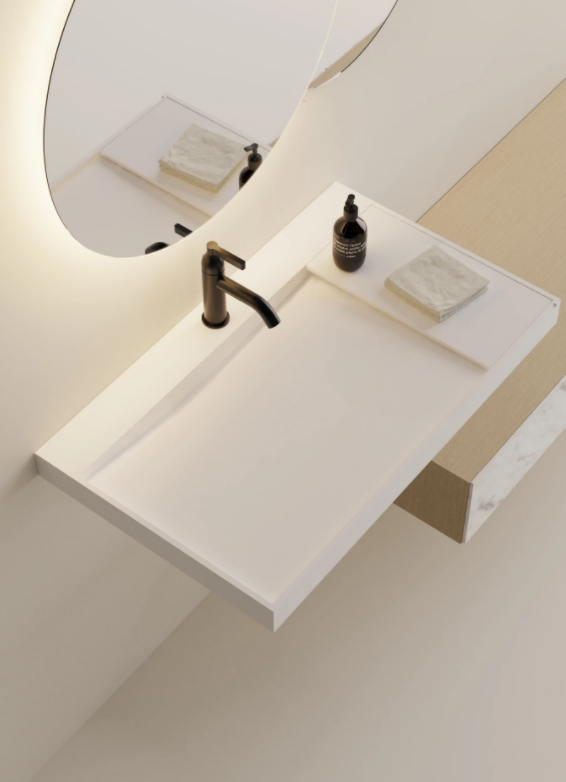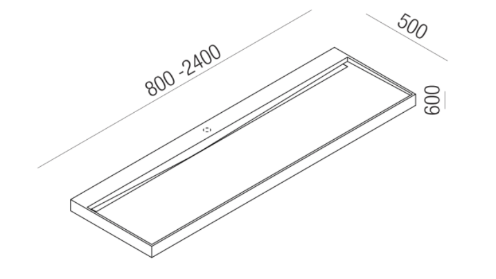 Litorale is a washbasin countertop with an uninterrupted linear basin available in lengths ranging from 80 to 240 cm. Only 6 cm thick, Litorale is manufactured in solid surface and it can be equipped with a number of trays available in three different sizes (20, 40 and 60 cm) made either in iroko or in the same material as the basin itself. For lengths above 160 cm, Litorale can be equipped with two faucets. In this case, to ensure proper flow management, the basin has to be equipped with the same number of wastes. The washbasin allows the installation of both over-countertop and wall mounted taps.