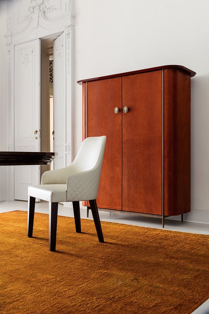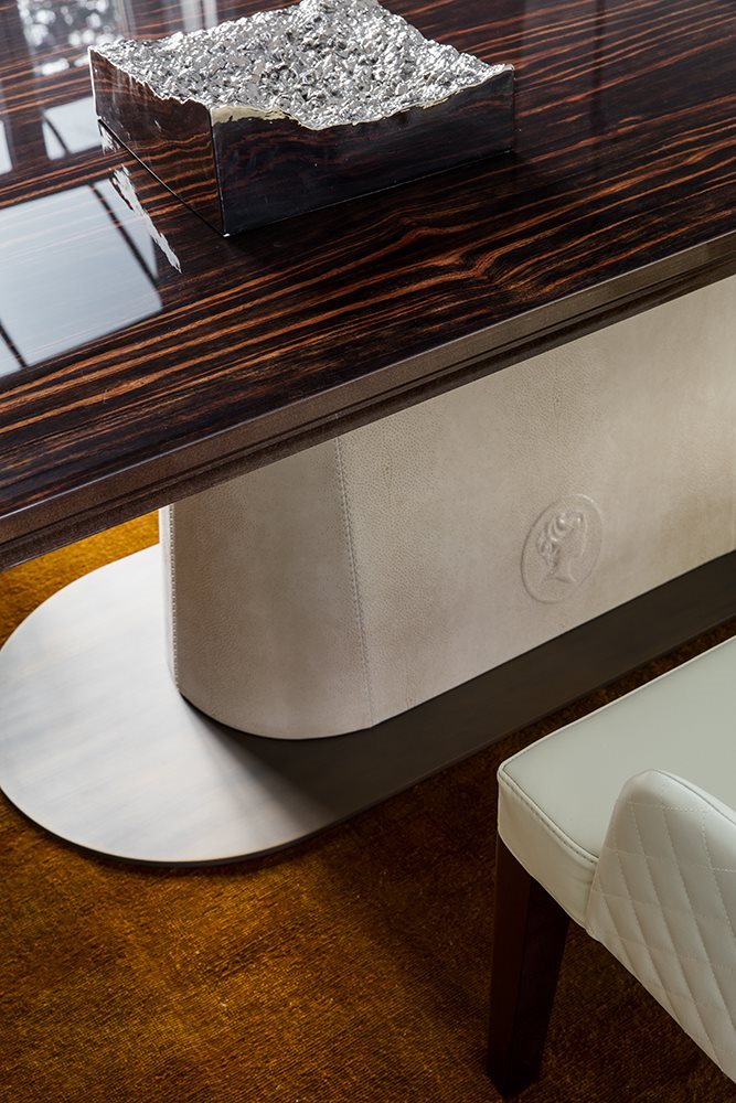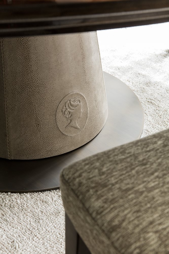 Judy’s architectural lines, combined with a refined selection of finishes, make it an exclusive table, suitable to be used in any classic or modern house. The elegant relief cameo positioned on the central support further enhances the stylish appearance of this design product.