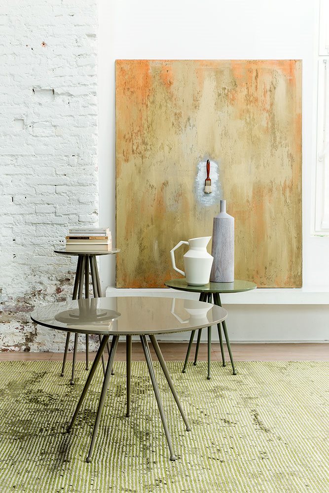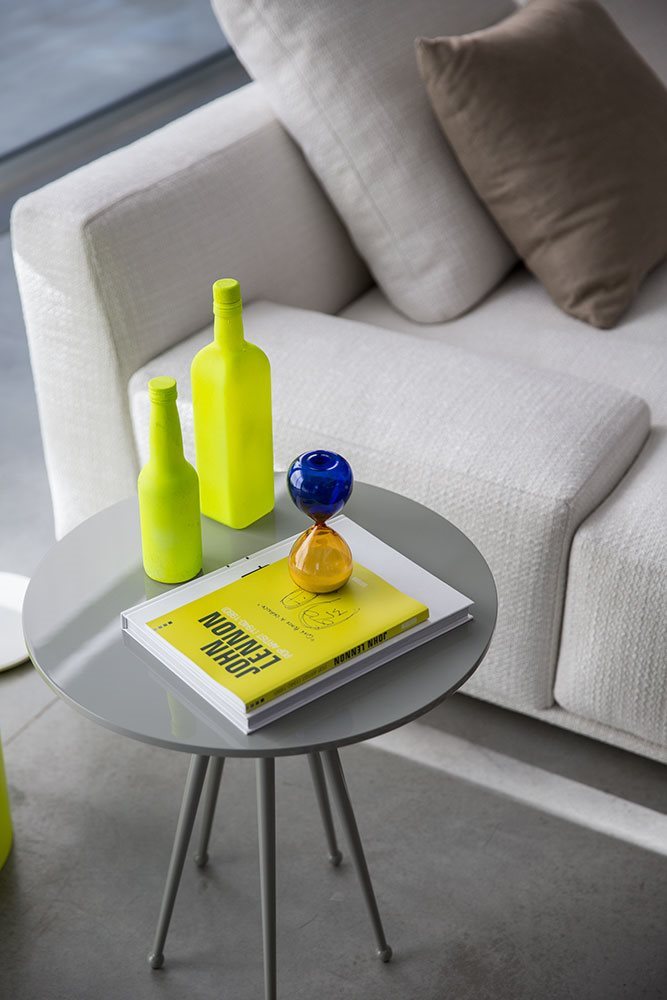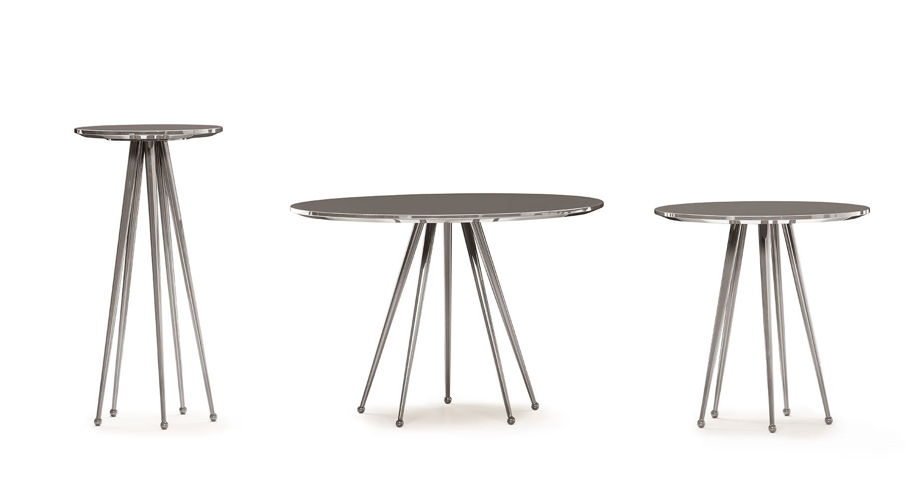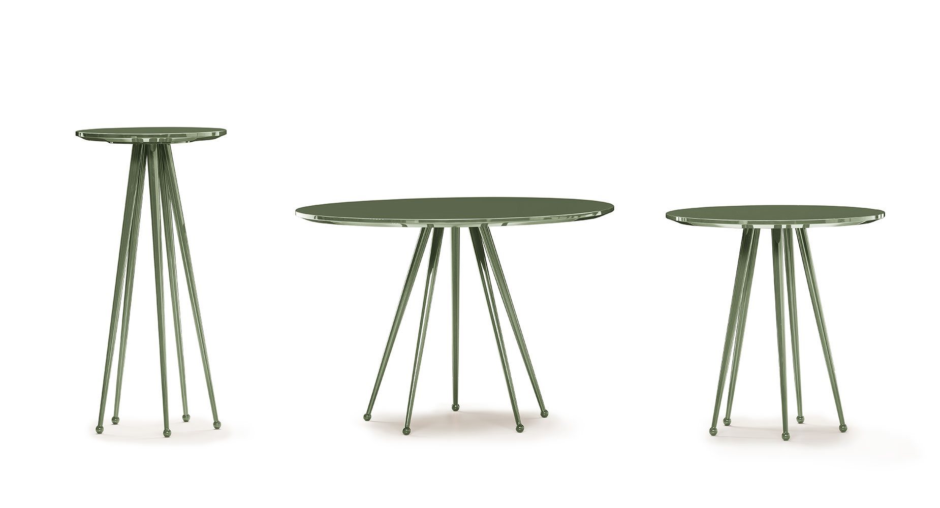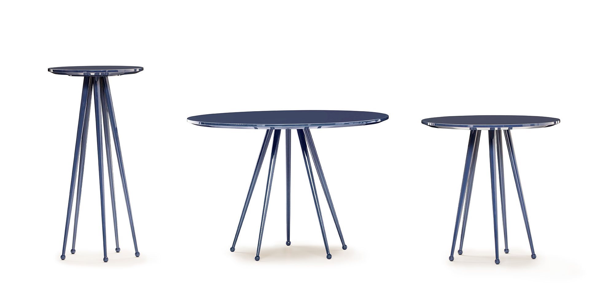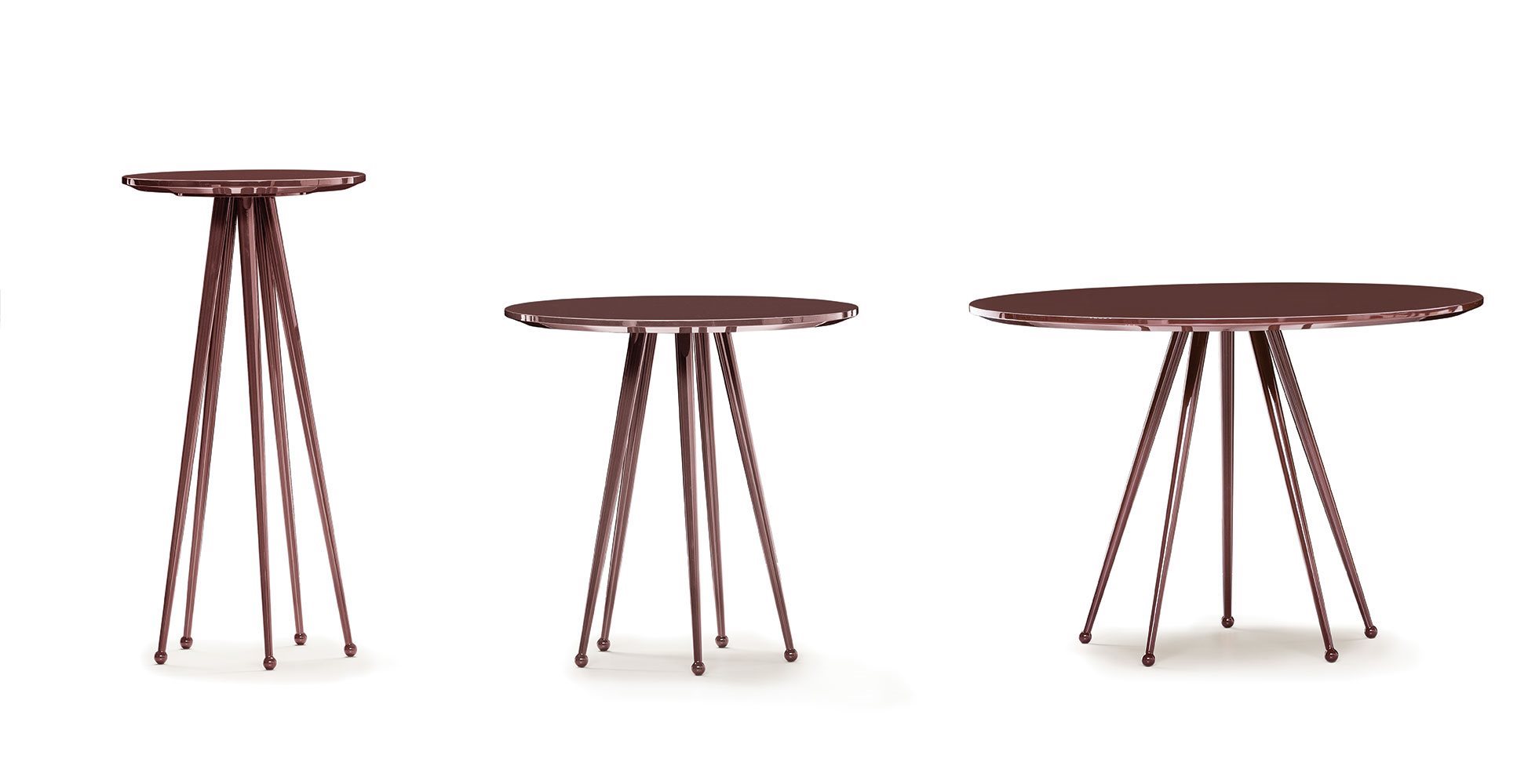 Small tables. Structure: in metal with 5 legs. Structure finishing: lacquered. Top: MDF. Top finishing: lacquered.