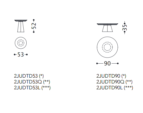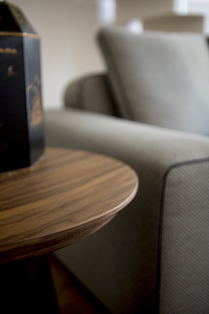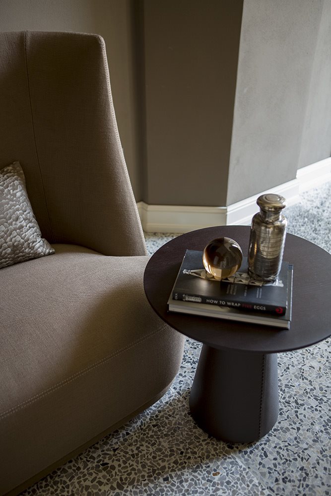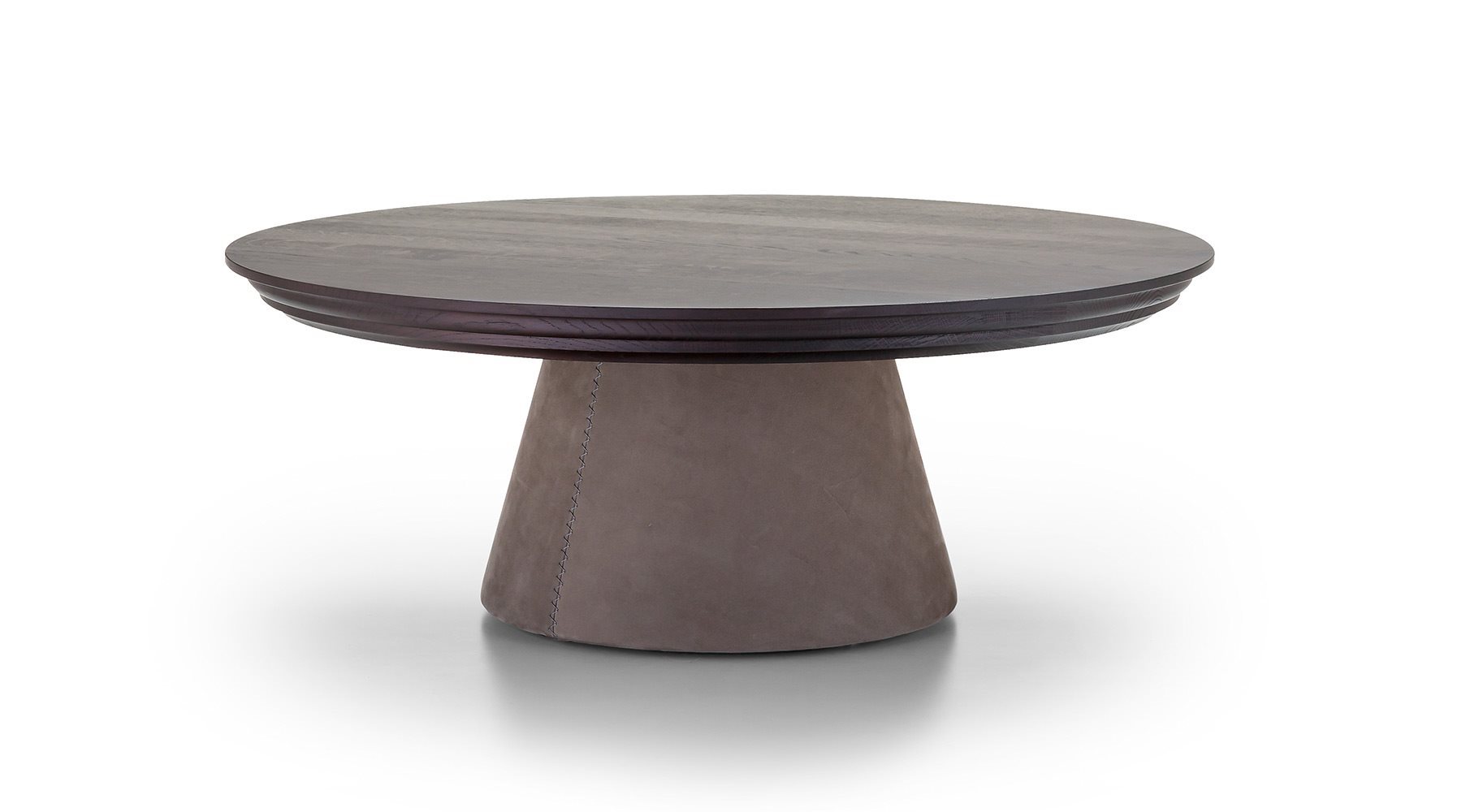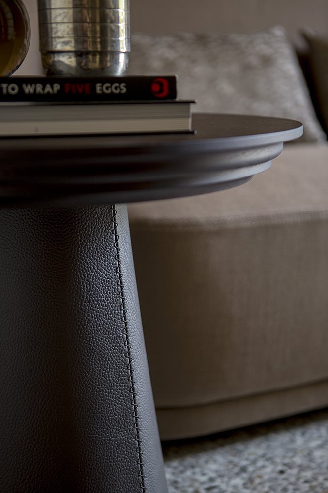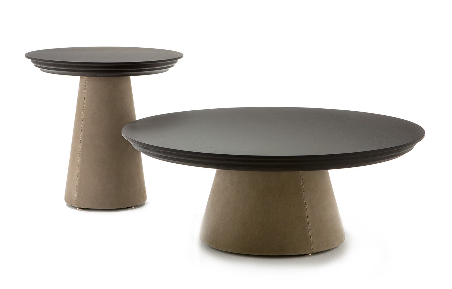 Small tables of two sizes with wood base covered in leather. Top in solid wood-finishing options: WALNUT, DARK OAK.