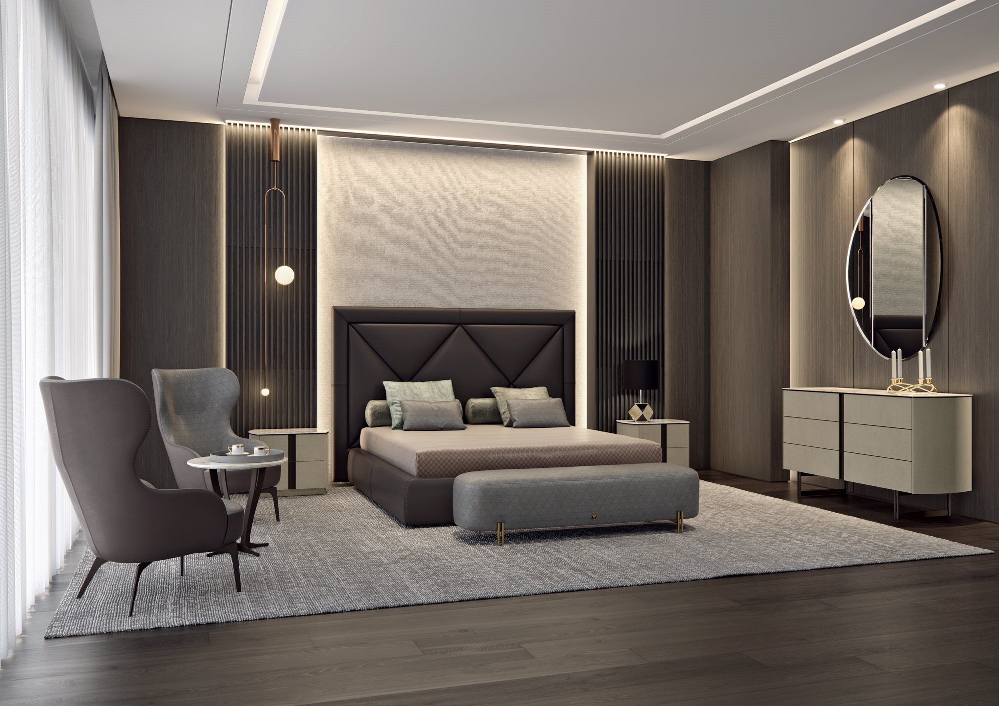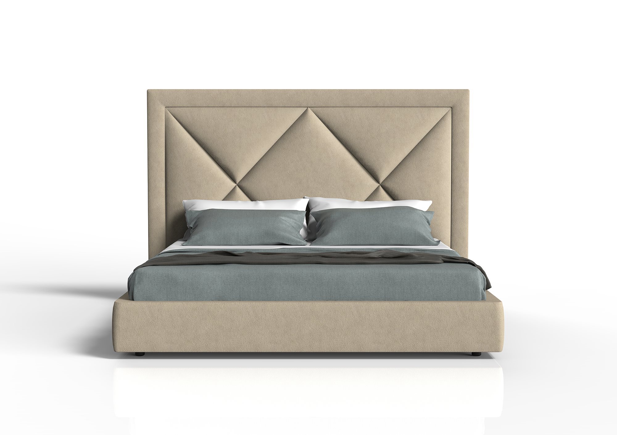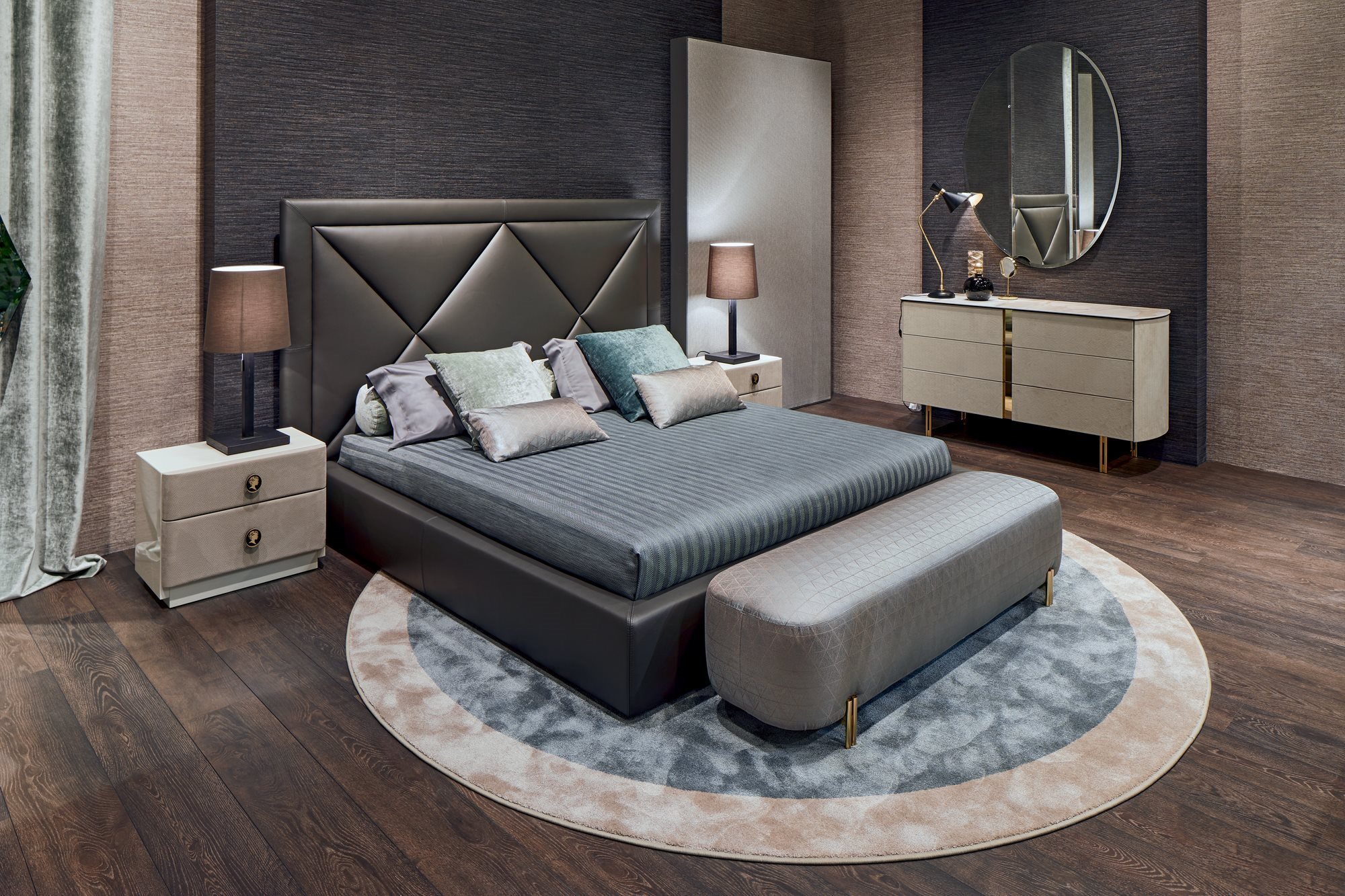 A large headboard and a design that evokes tradition: these are the peculiarities of the Corniche bed, the focal element of every environment it is put in. Inside the headboard a frame sets a geometry that is reminiscent of a capitonné work in XXL format: a perfect union between modernity and tradition. Thanks to these characteristics, the Corniche bed fits with elegance and character in classic and contemporary environments.