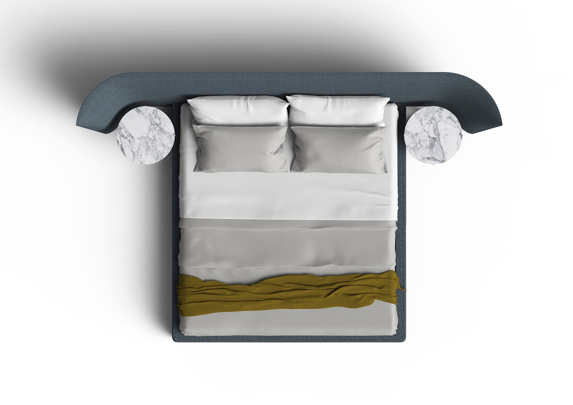 The defining feature of the Semira bed is the wide embrace of the bed head which stretches round to encompass the bedside tables, creating an intimate atmosphere and conjuring up an instant feeling of comfort. Its soft, cosy shape fits perfectly into modern and classic settings, thanks to its simple style and timeless design. The covers, featuring the best of skilled craftsmanship, can have a buttoned-back or quilted finish with an original geometrical texture.