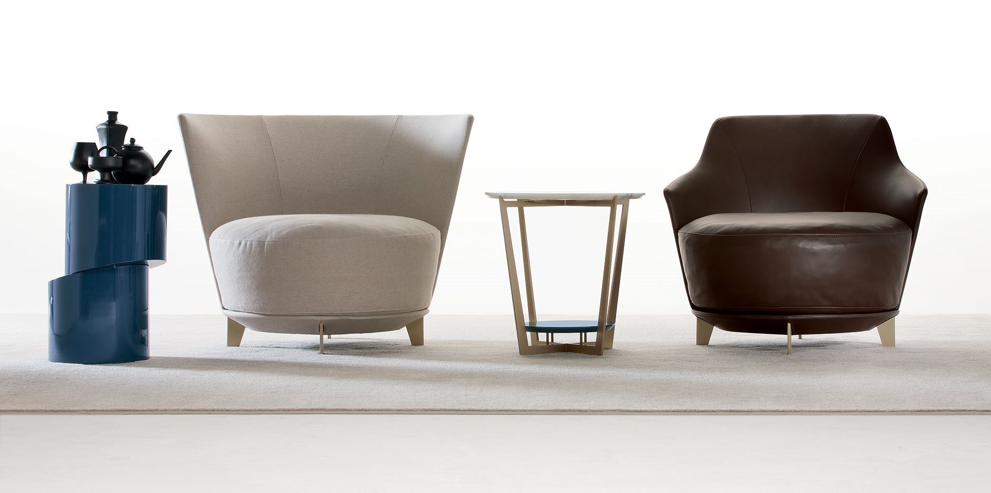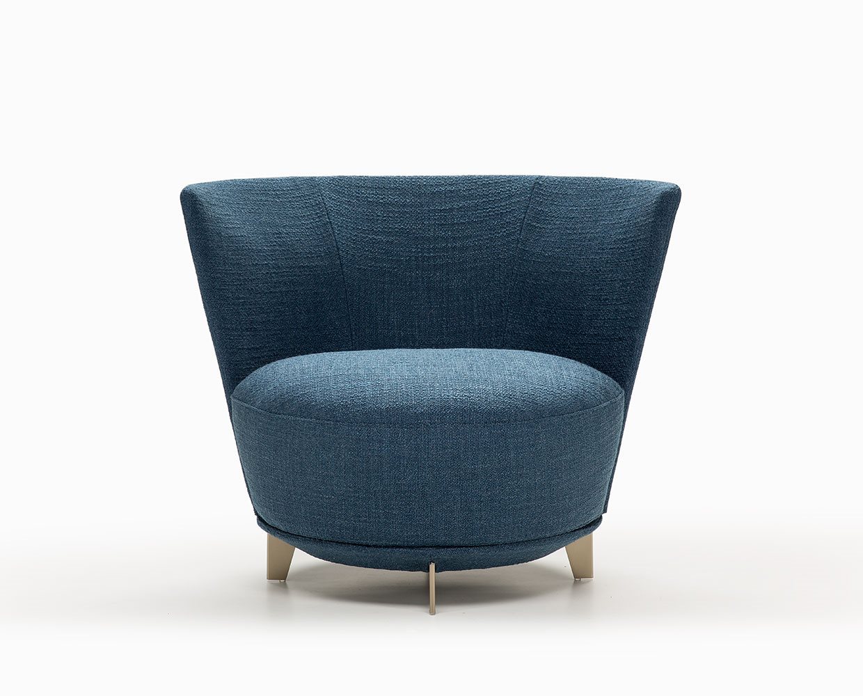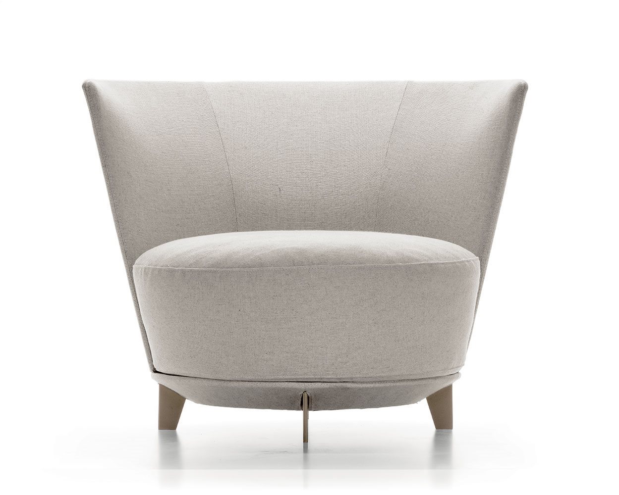 Poltrona. Struttura portante: multistrato, massello di legno. Imbottiture: Schienale in poliuretano espanso (densità 21 Kg/mc). Seduta in piuma d’oca con inserto in poliuretano espanso (densità 40 Kg/mc). Piedino: in metallo (finiture French Bronze o Gun Metal).