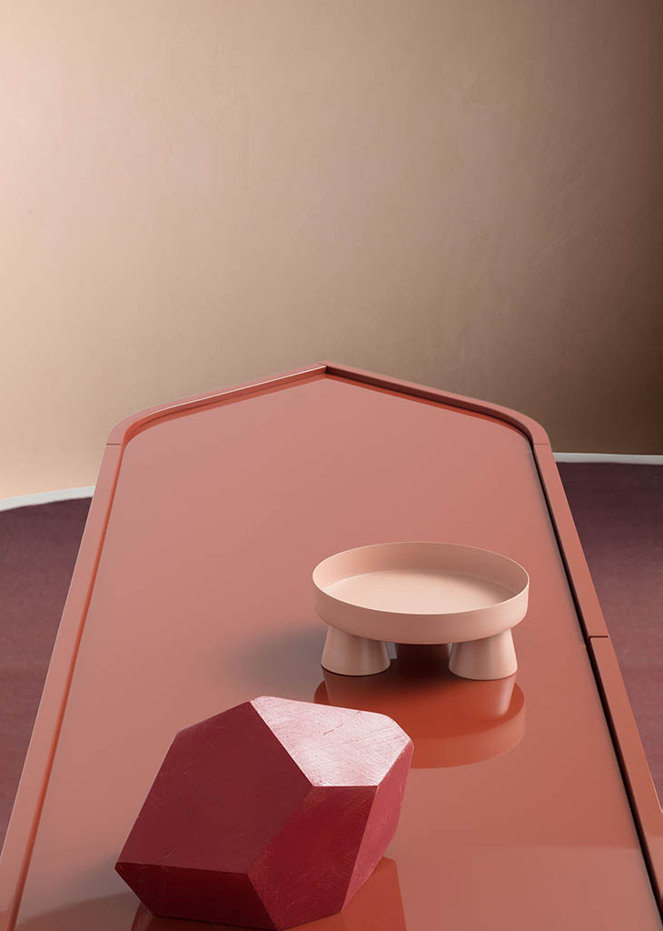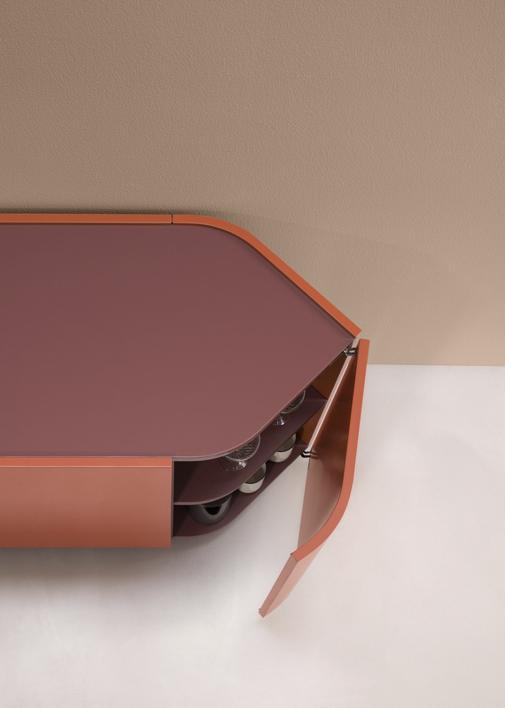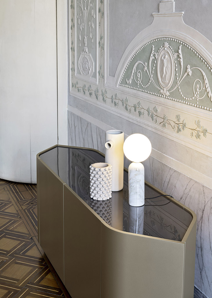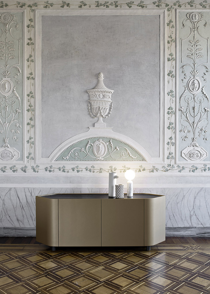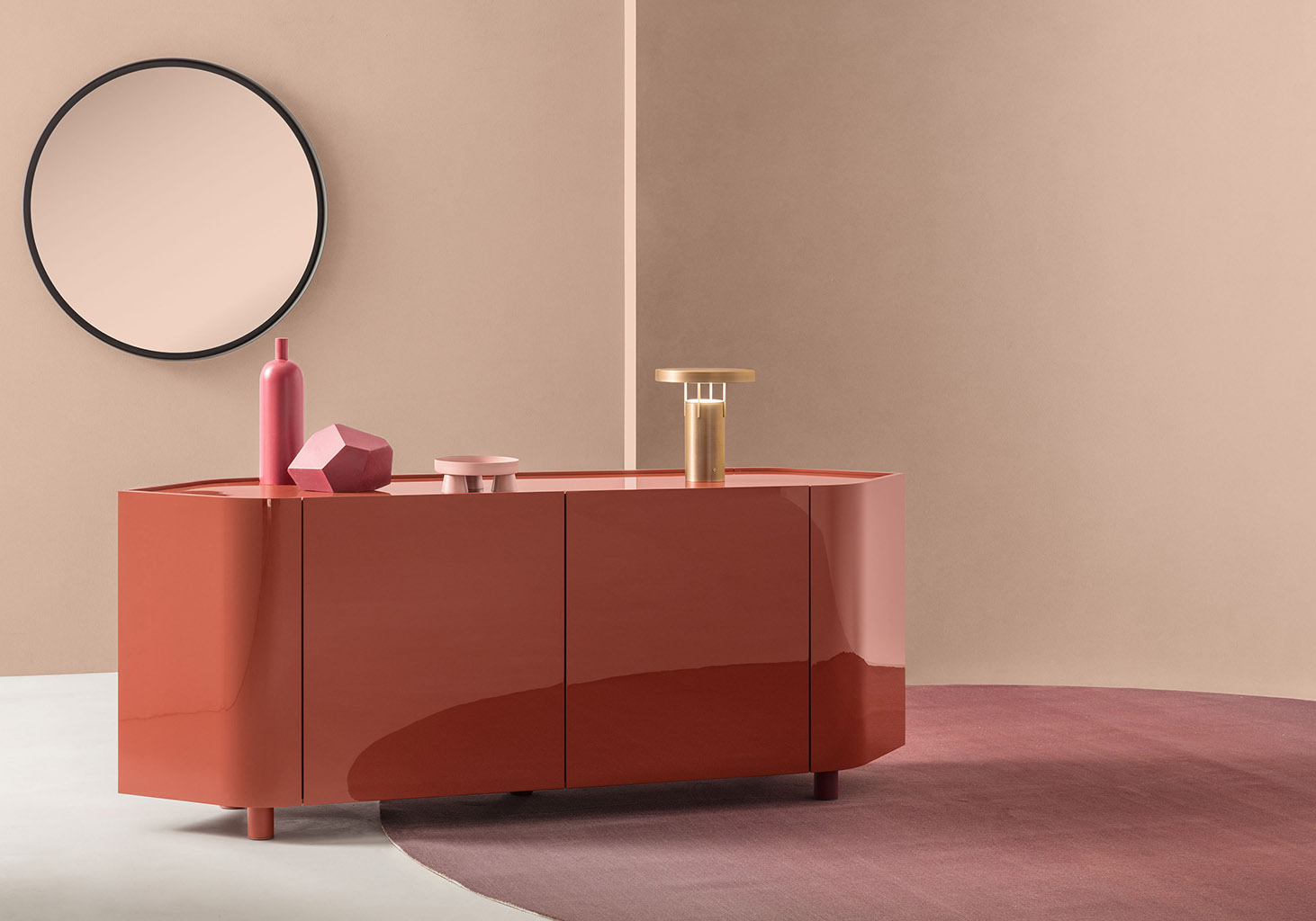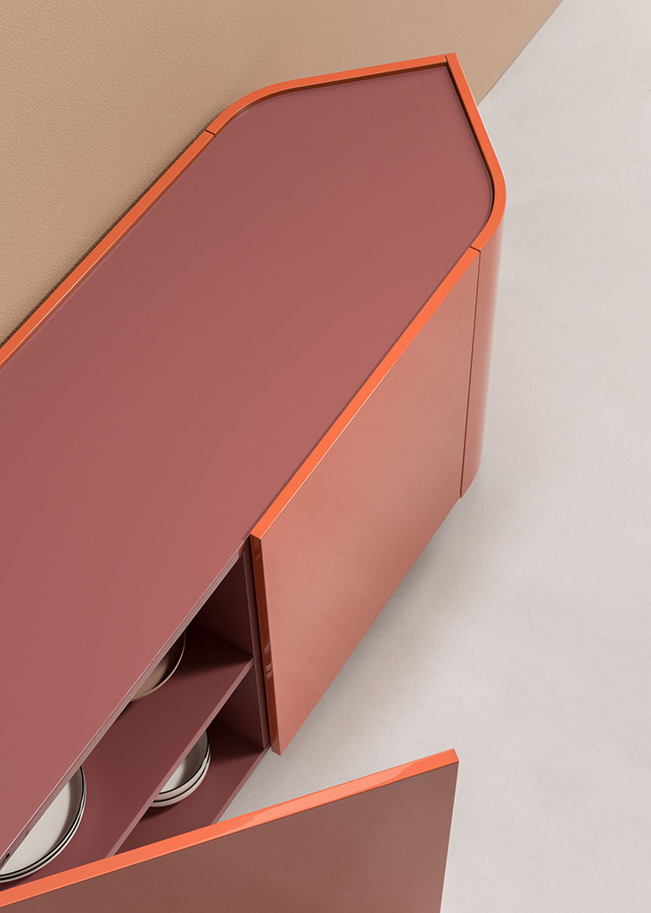 Gioberg is a sideboard with 4 doors. Combine two lacquered shades to have fun with colour across the fronts and tops/interiors. The unit is equipped with concealed soft-close hinges.