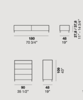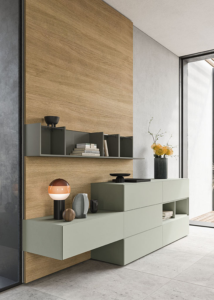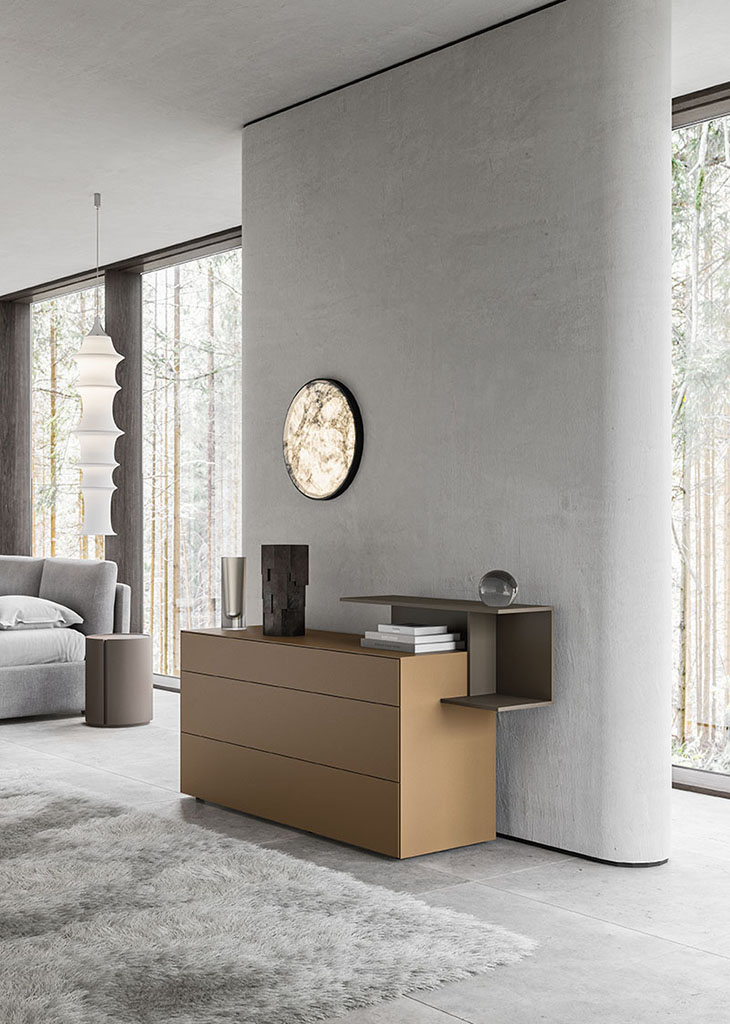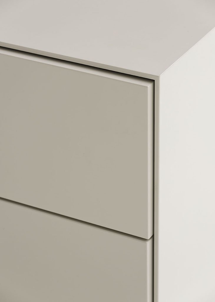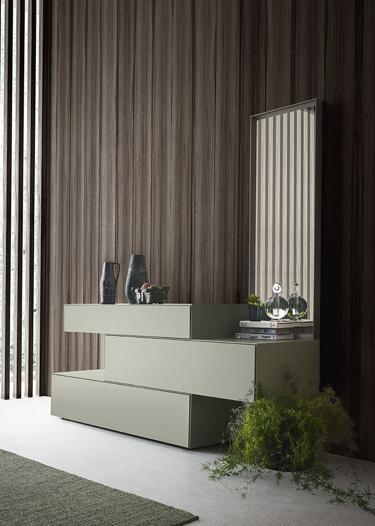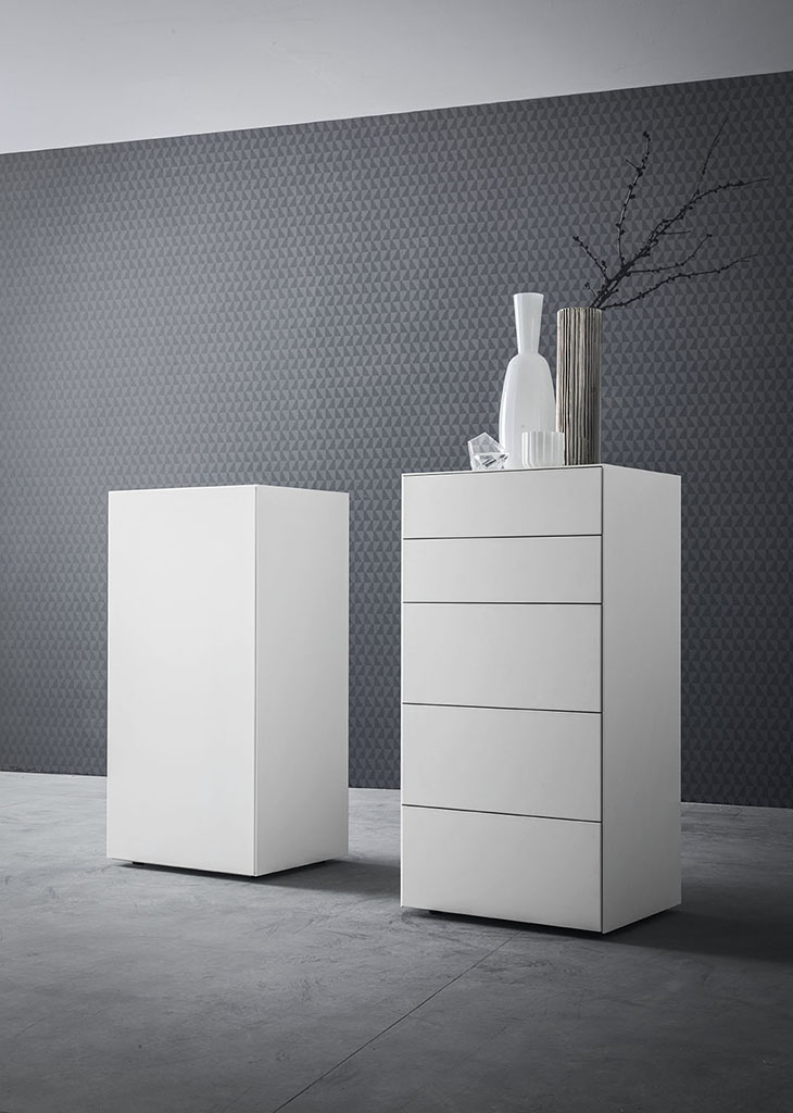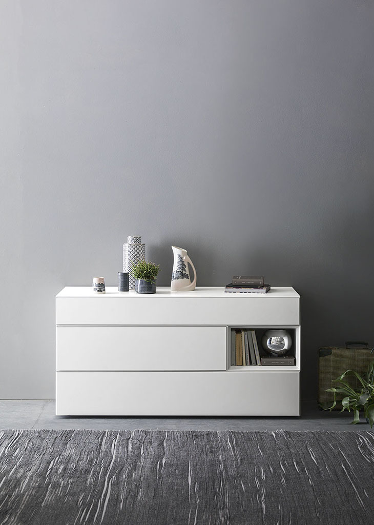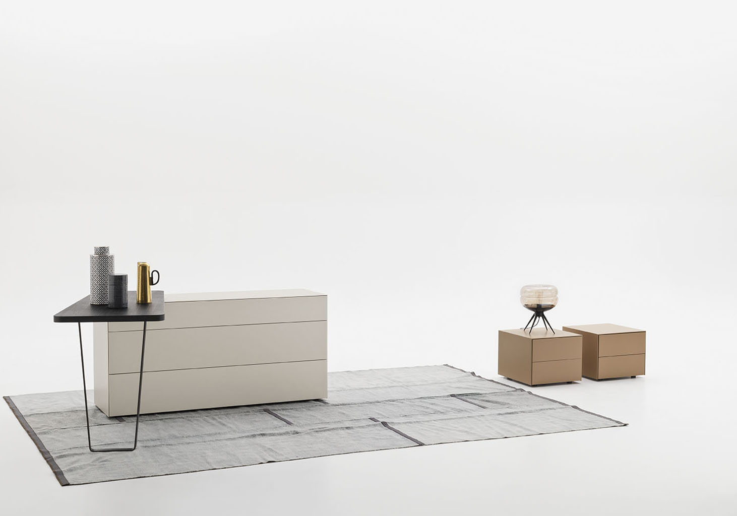 Fil designer bedroom storage units stand out for their sleek, minimalist lines. Fil is a bedroom suite that is extremely modular. It comes with two types of feet or can be wall mounted, creating a host of compositional possibilities. There are also two ways to open the units, either using the small, asymmetric metal handle or the push-pull mechanism.