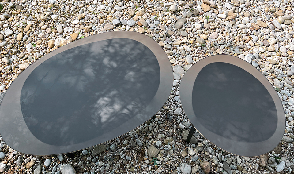 Tsuki is a range of occasional tables with a metal frame, tempered glass top and round satin-finish edge.