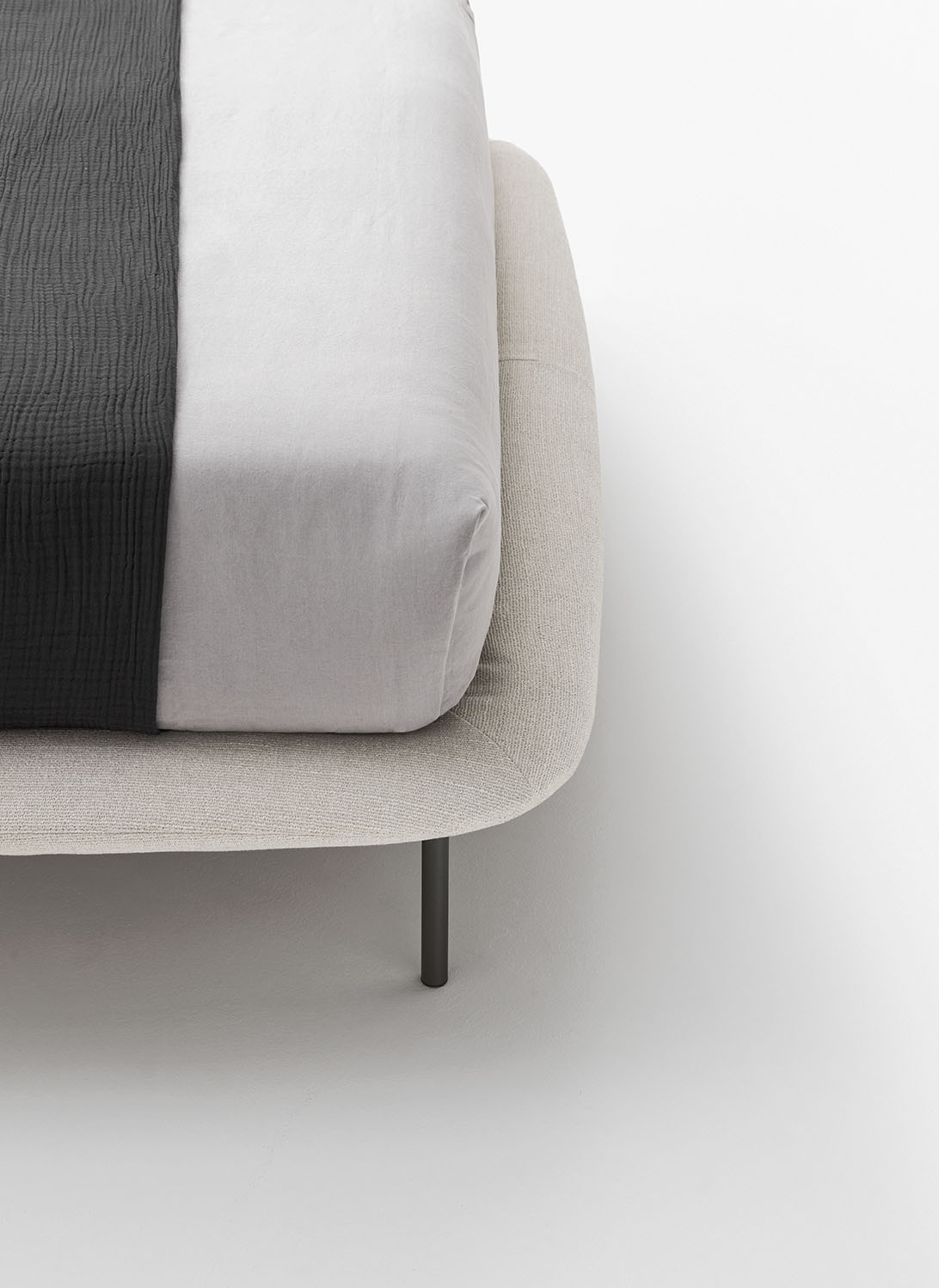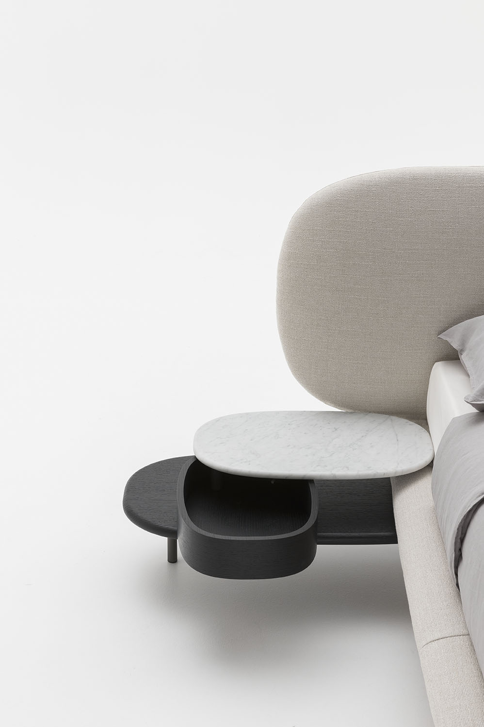 The Ney range of beds is inspired by the organic shape of river pebbles, rubbed smooth by the water. The soft design that defines both the padded elements and the double shelves gives the composition the enveloping and functional look of a bed that lacks nothing.