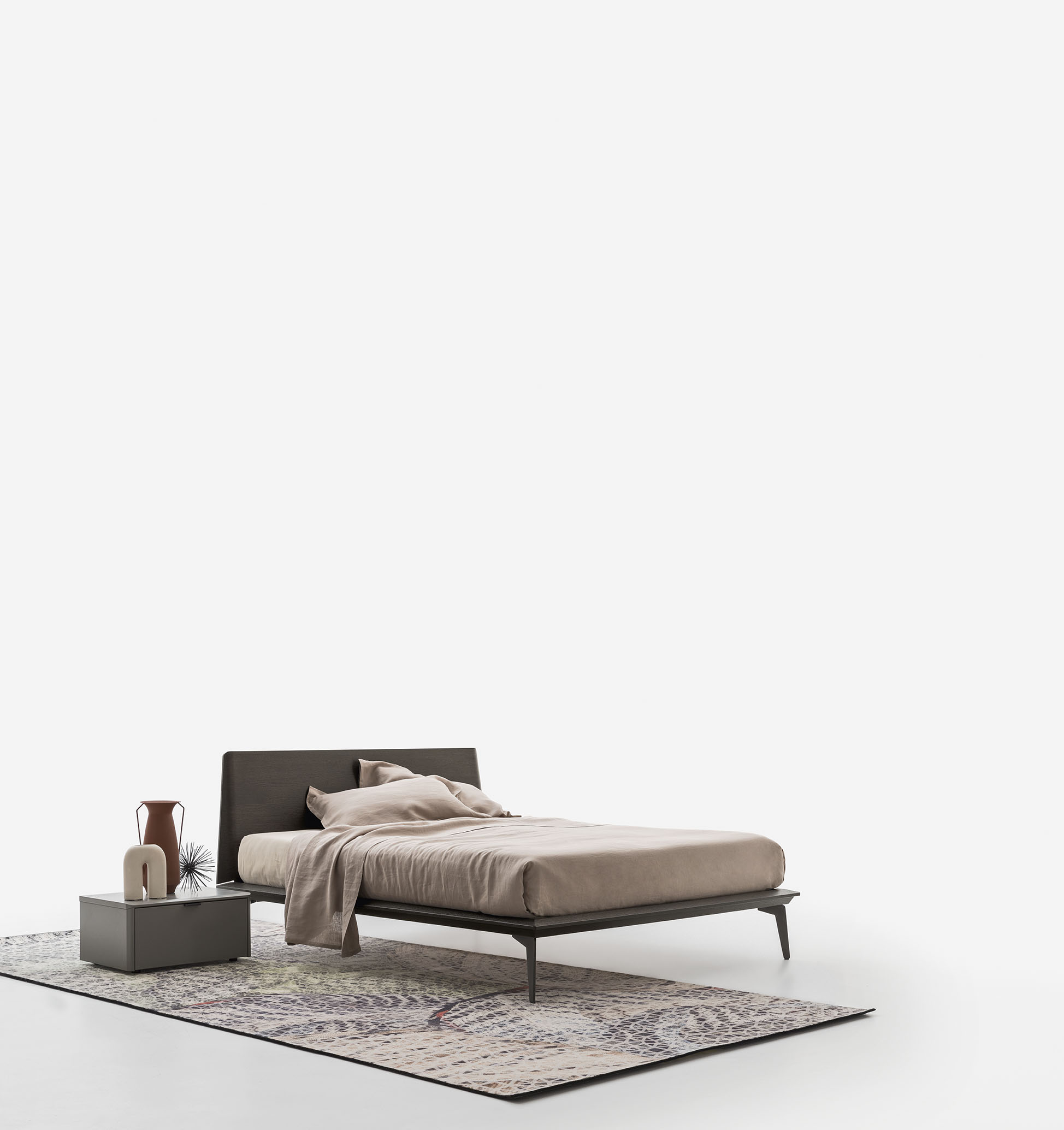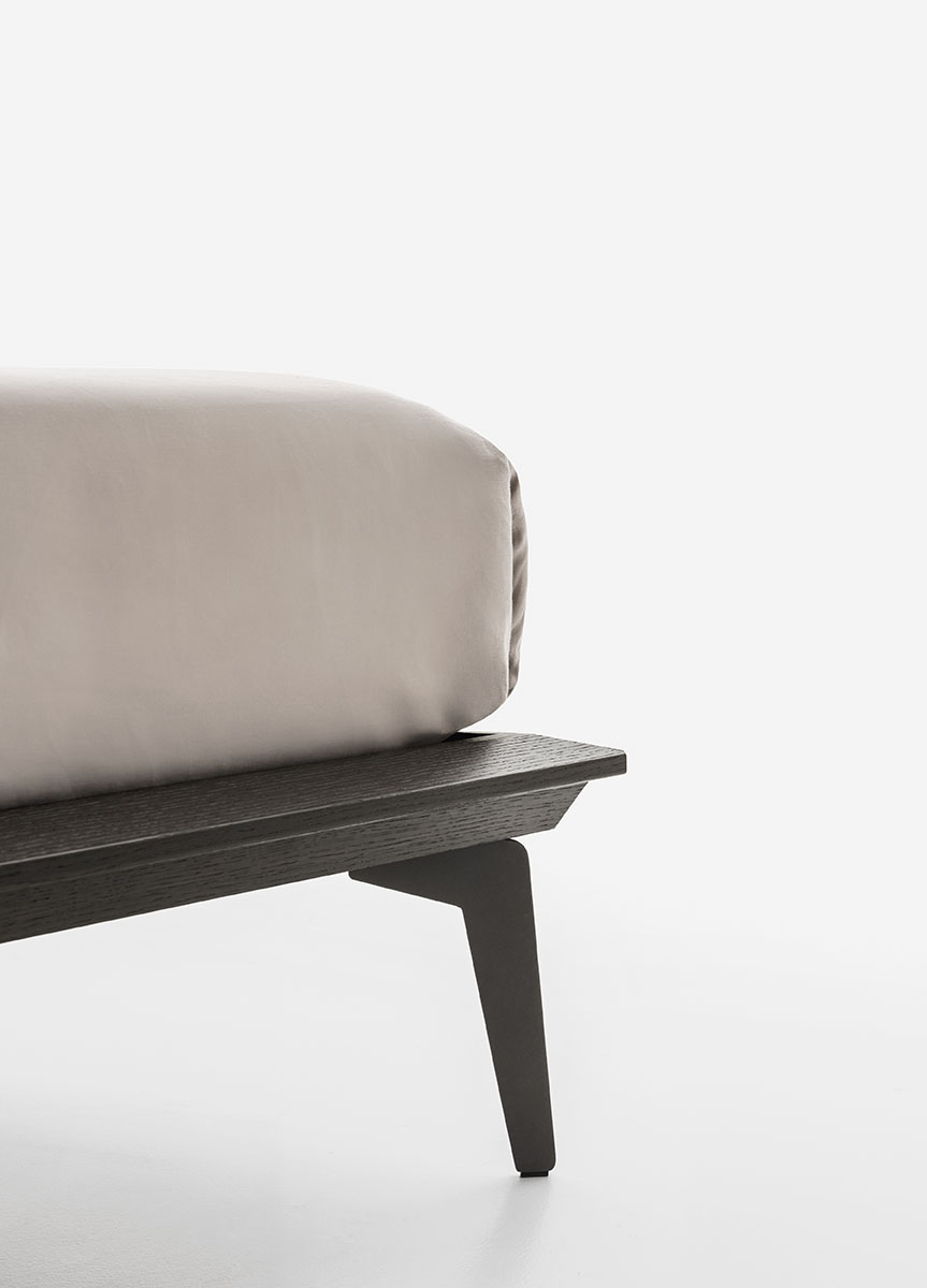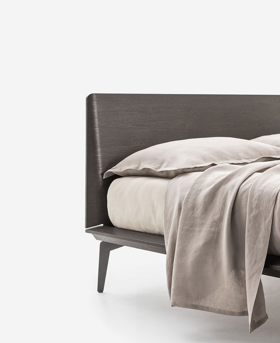 The Xilo bed has a wooden frame and metal feet. It stands out for the rounded headboard sides and for the bold yet light-weight shape of the platform.