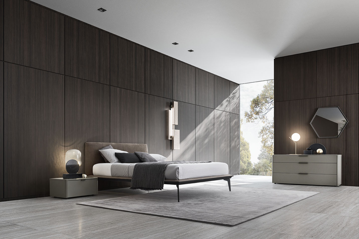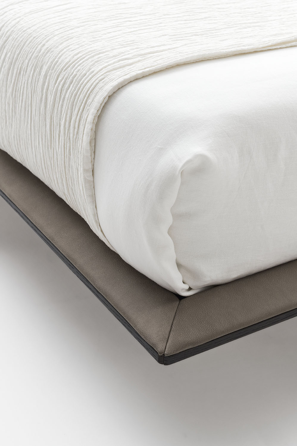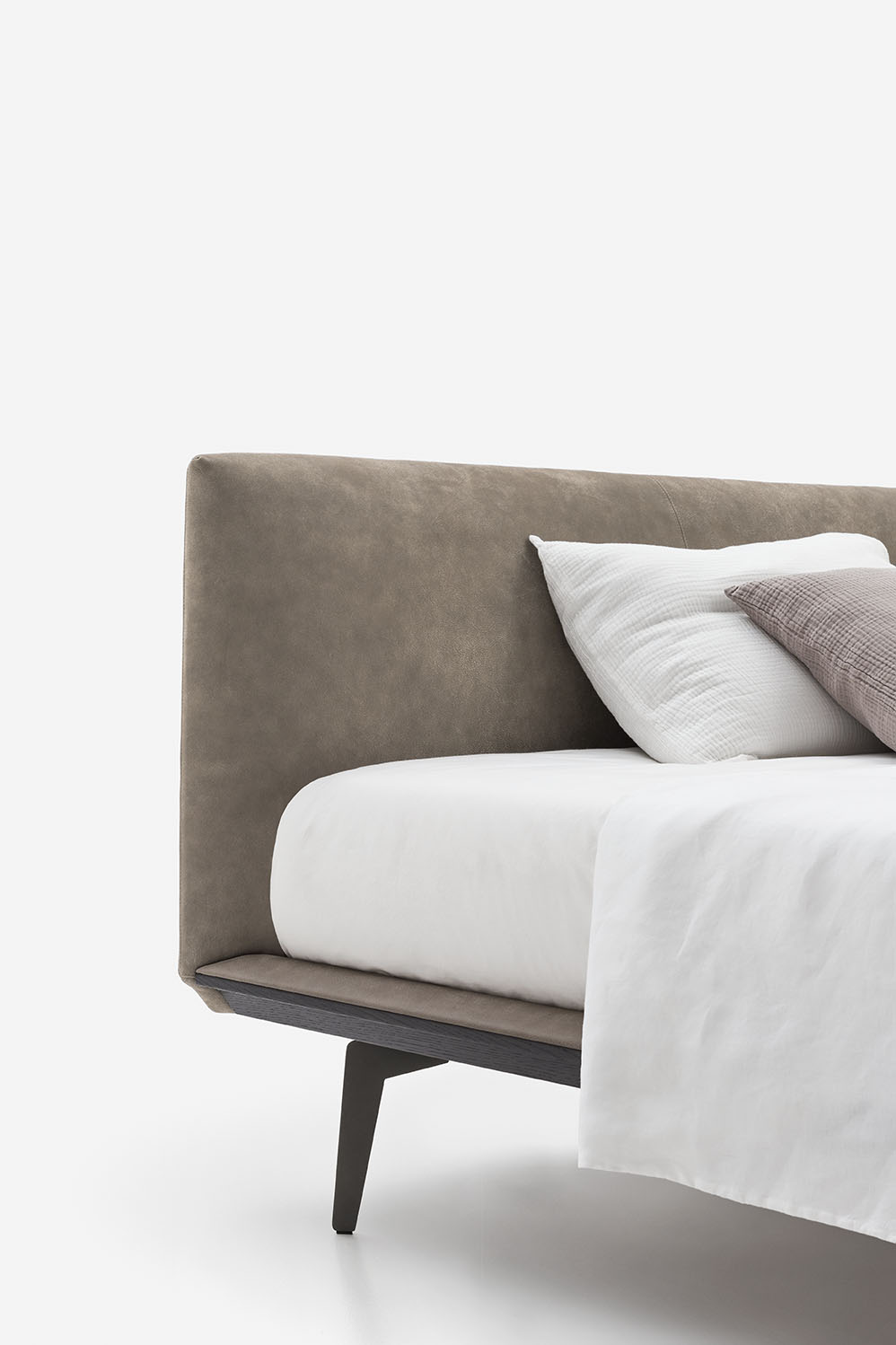 The Xilo bed has a wooden frame and metal feet. It stands out for the rounded headboard sides and for the bold yet light-weight shape of the platform.