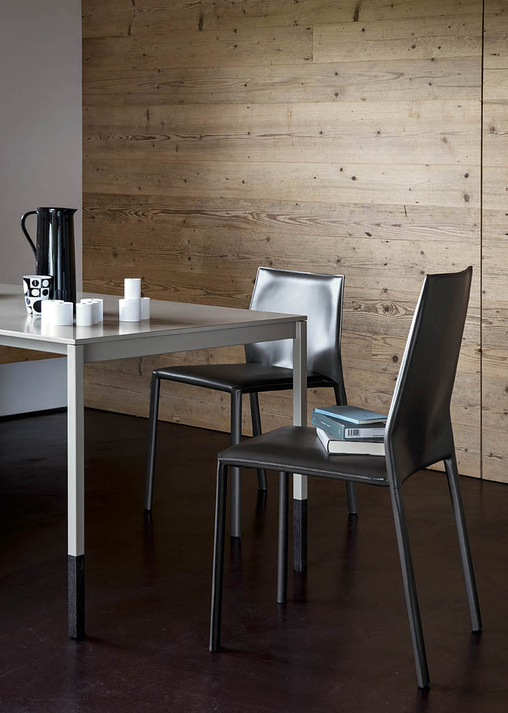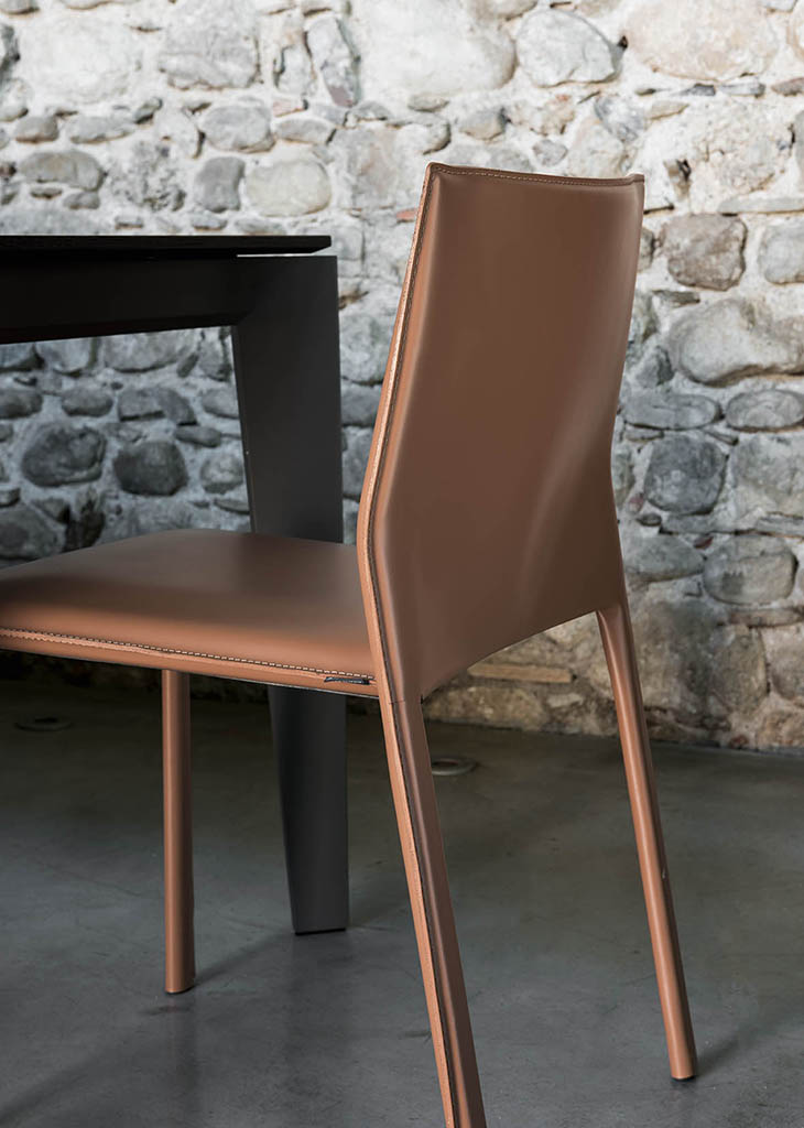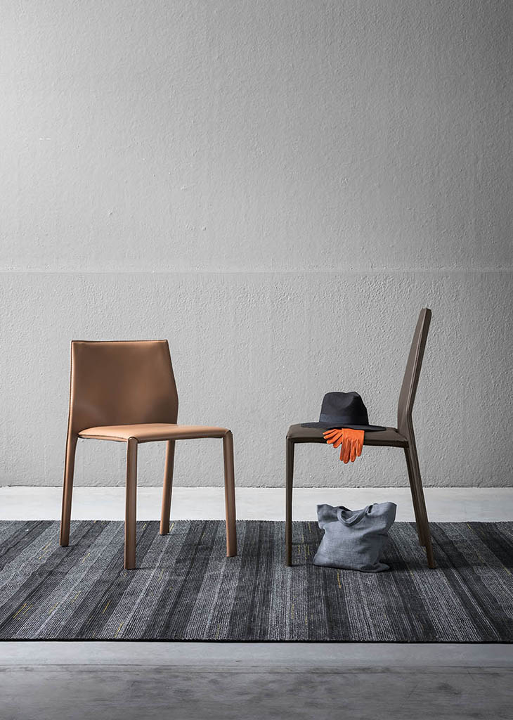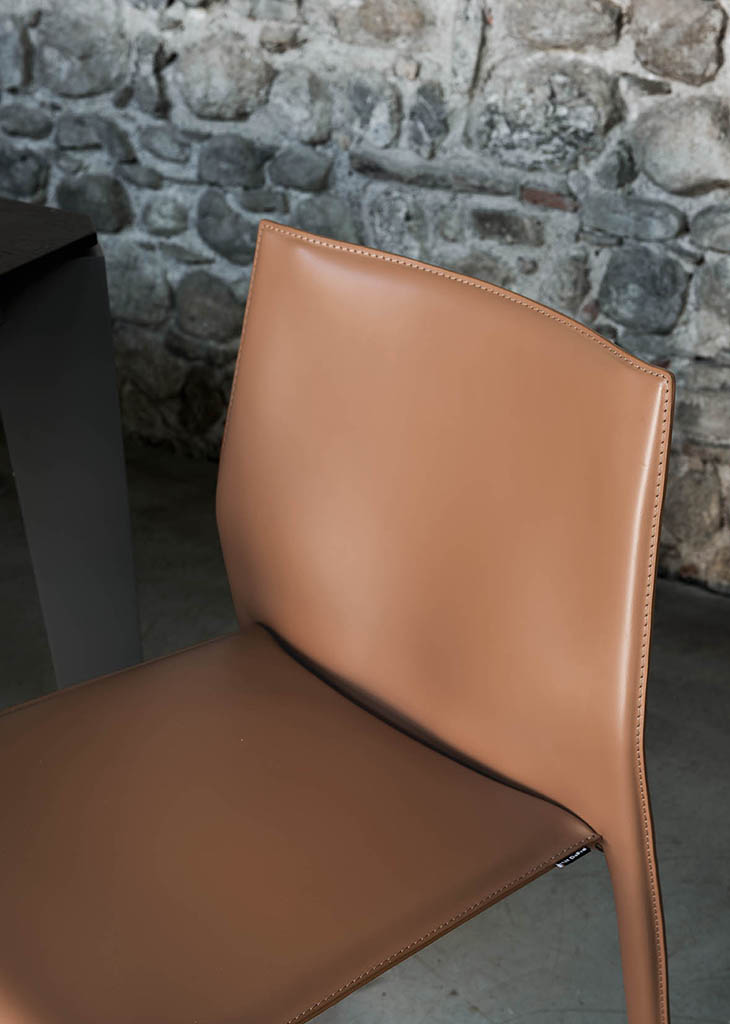 Corium is a very compact chair, available upholstered in cowhide, fabric, leather and ecoleather. It can have a 93 cm high back or a more compact 80 cm back.
