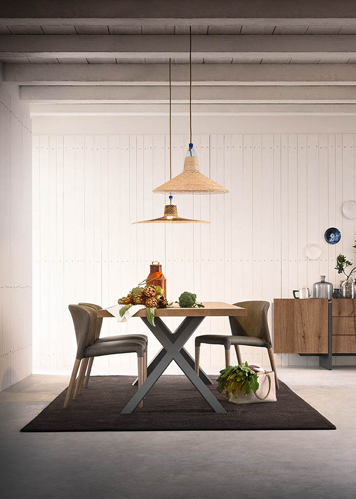 Board is a rectangular table with a metal frame and a wooden top, and it comes in a fixed or an extendable version. In the Board table, a painted metal base in a geometric shape finds the perfect partner in an aged-look knotted oak table top with irregular-shaped edges.