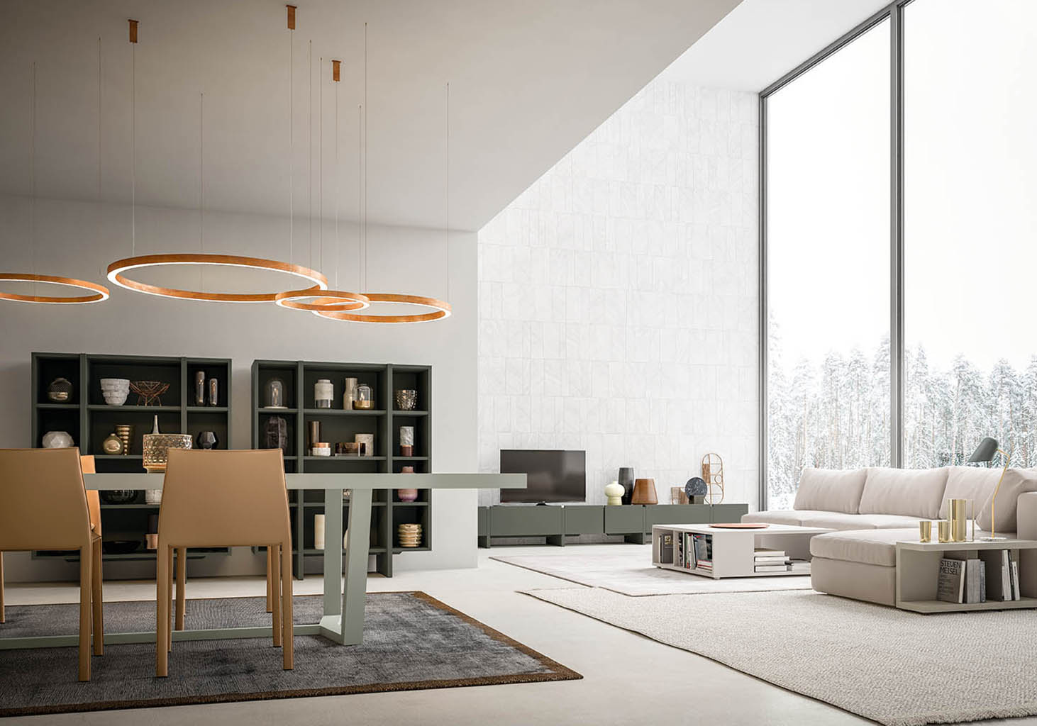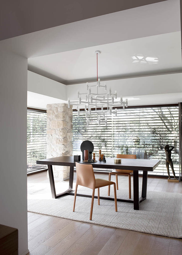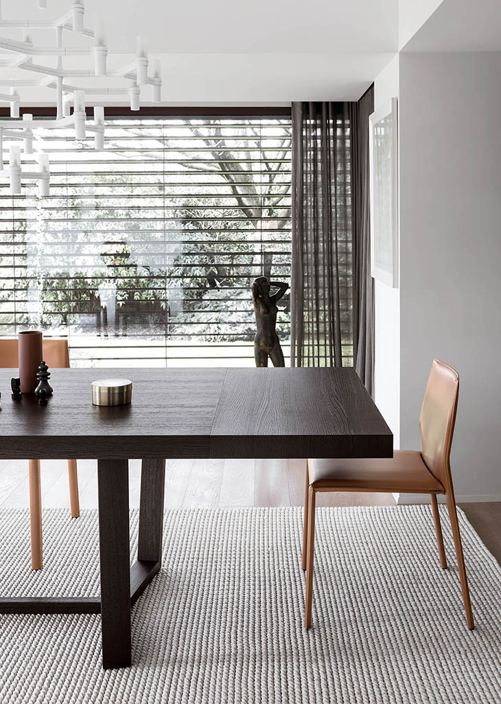 The Cartesio 2.0 table has a rectangular wooden frame and is extendable. Cartesio 2.0 stands out for its extra thick table top and extensions and for the unusual shape of the base, in which sloping legs join at the bottom to form a closed structure.