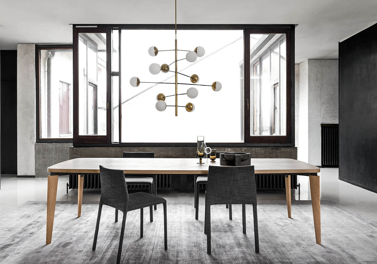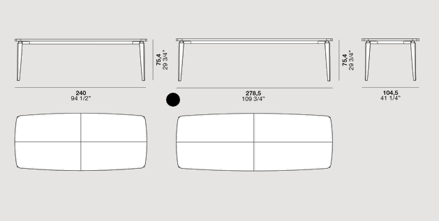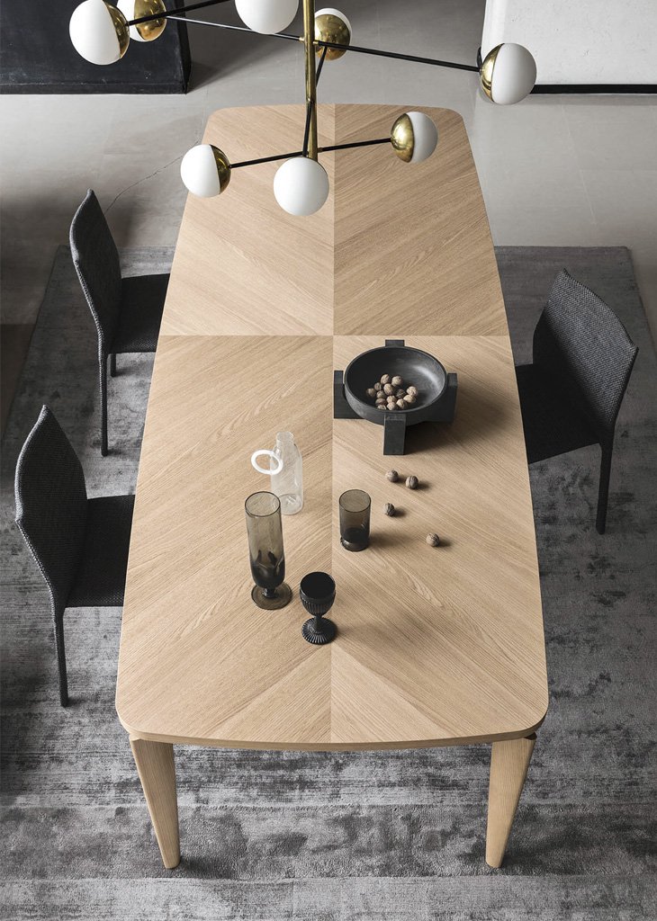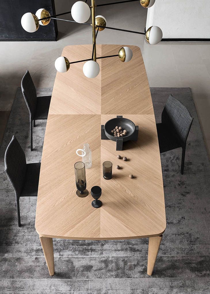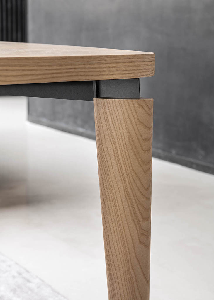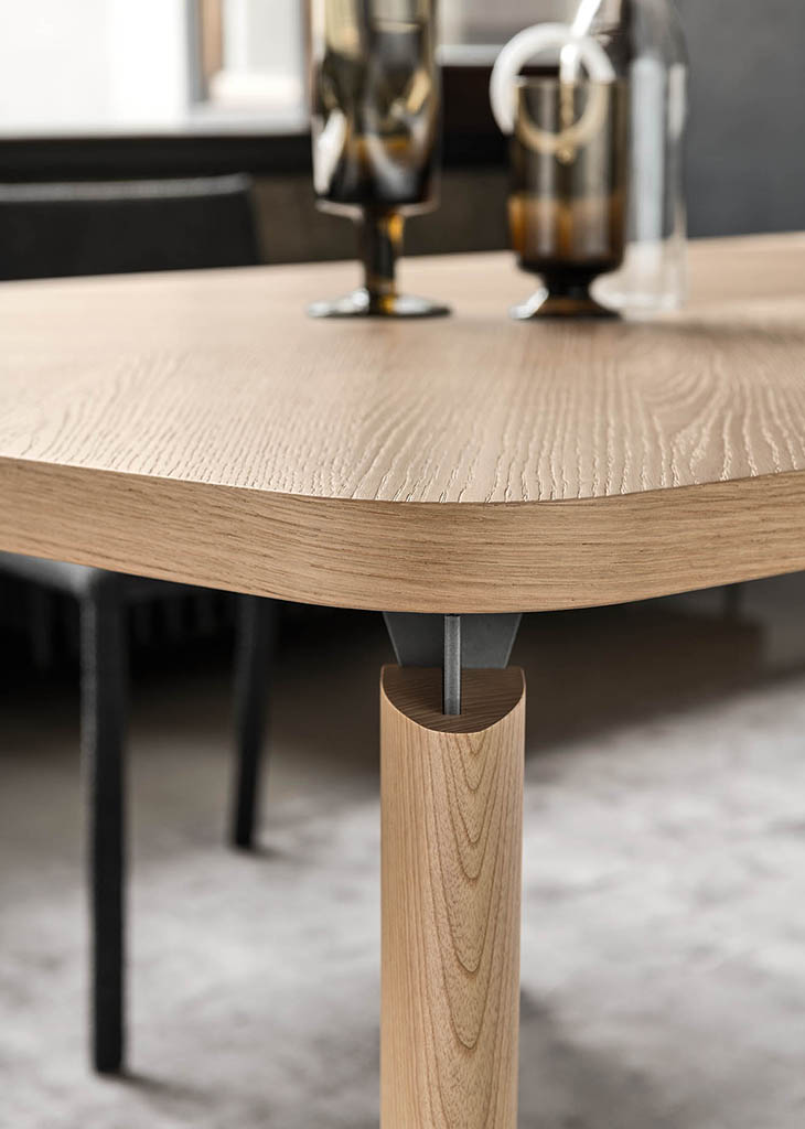 The Fyra designer table features sophisticated geometry and disjoints between the elements that result in a very expressive composition. The top, defined by a line that’s partly straight and partly curved, is divided into 4 quadrants which, with the wood graining, create a typical pattern from the cabinet-making tradition.