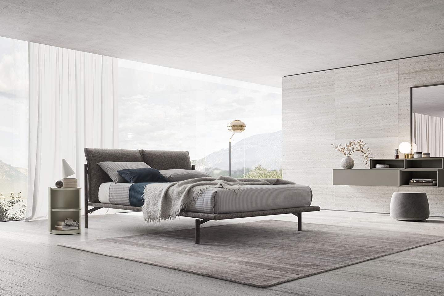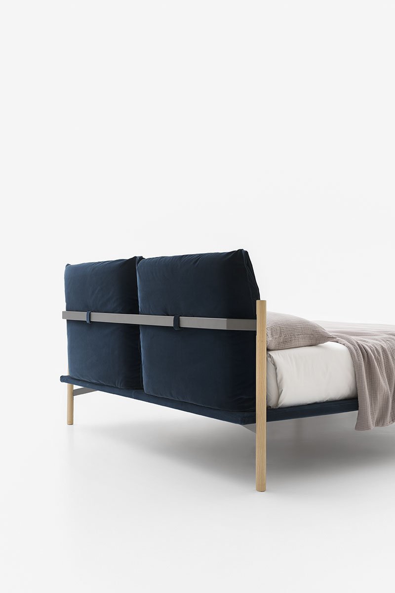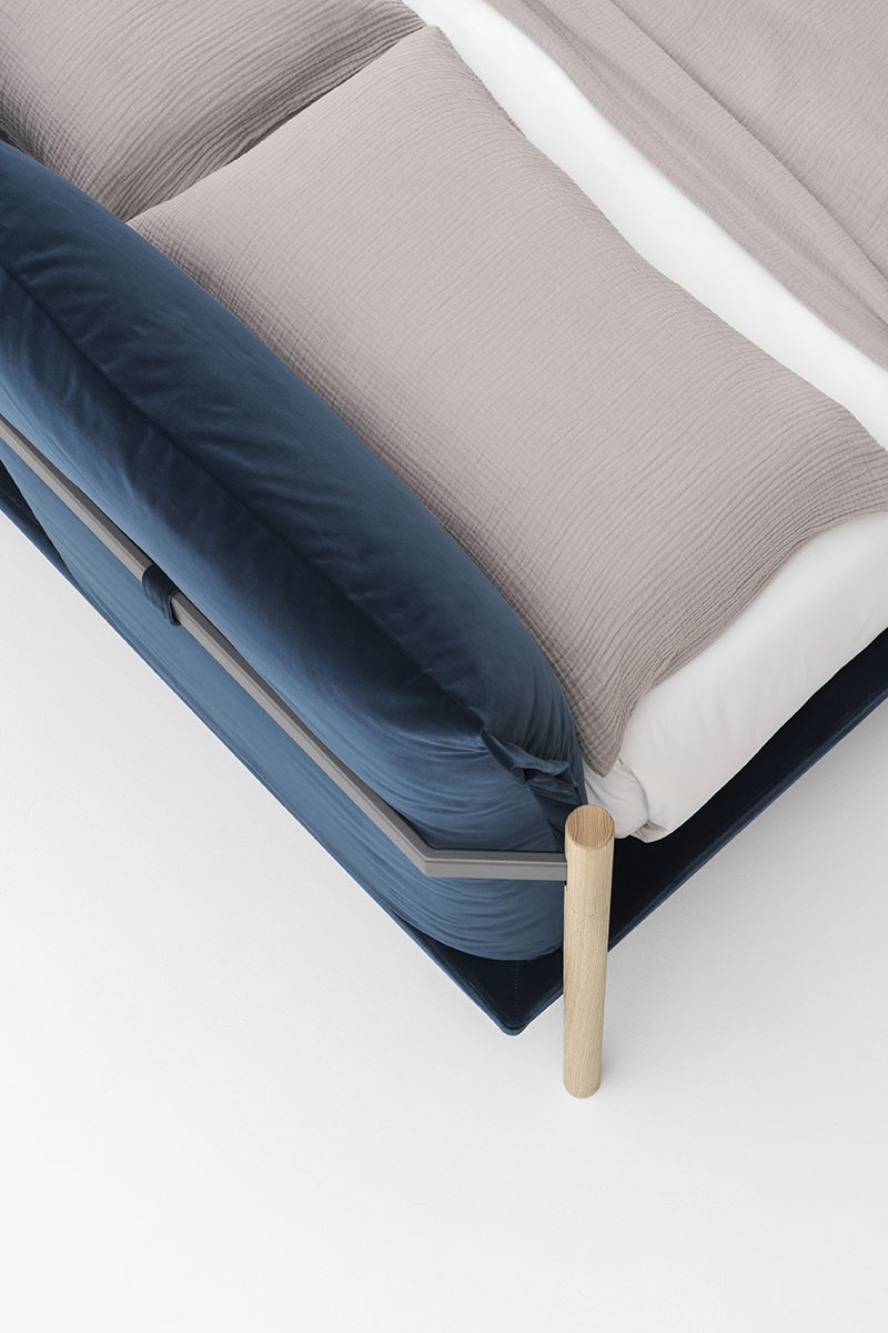 The Atlas upholstered bed has a wood and metal frame. The unusual shape of the feet and angled attachment to the bed platform create an intriguing floating effect, confirmed by the slim frame.