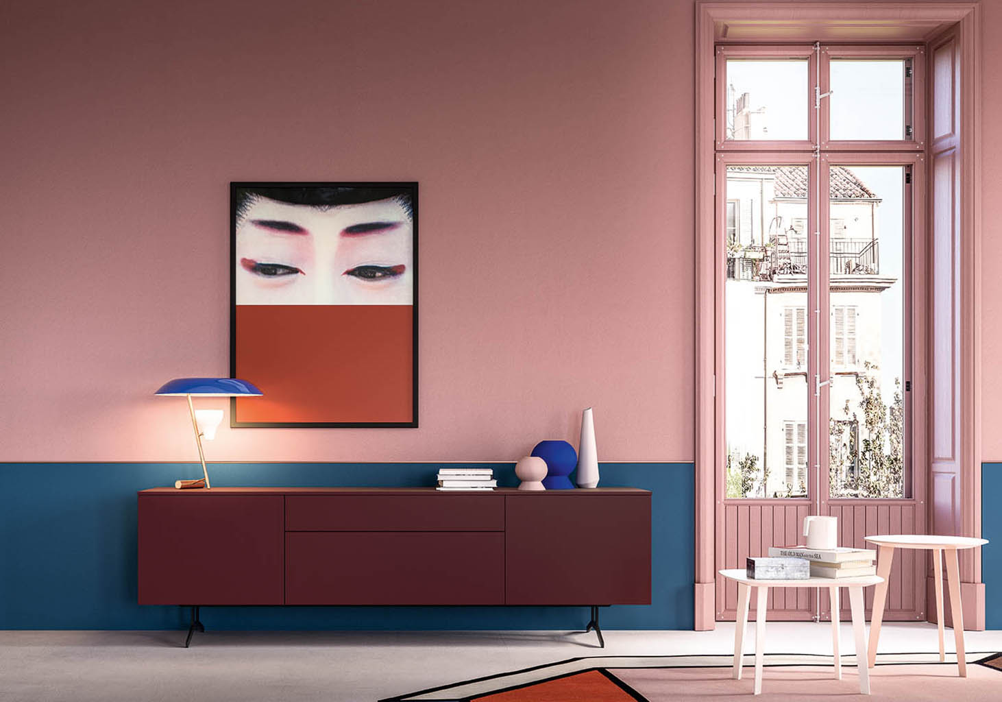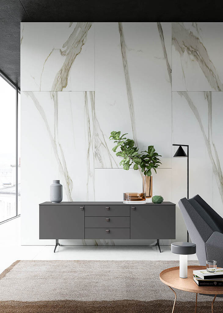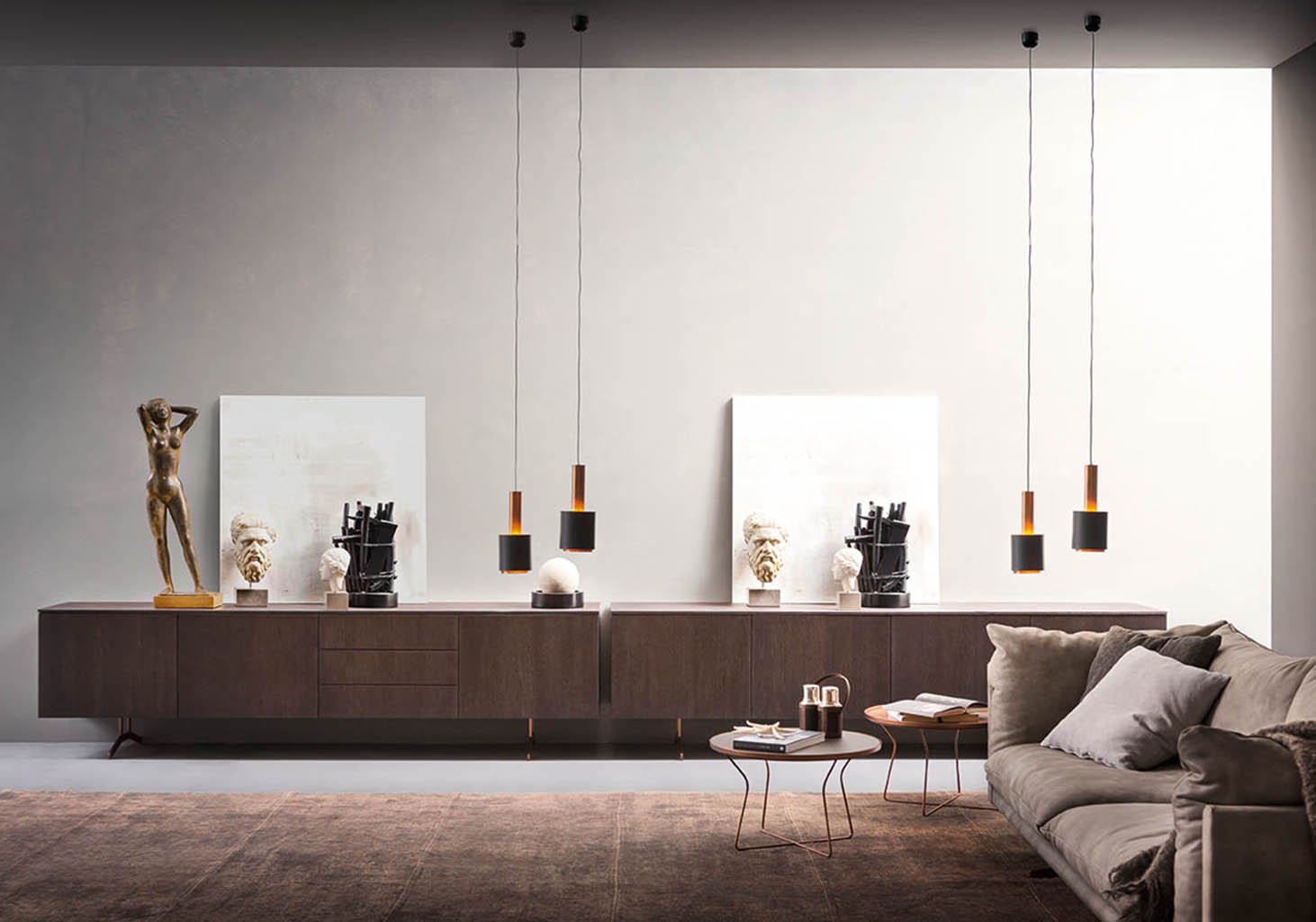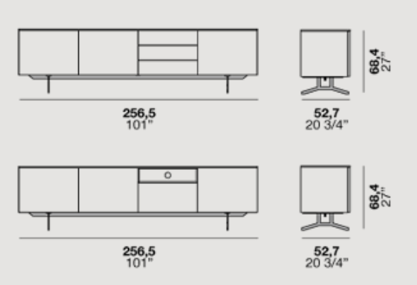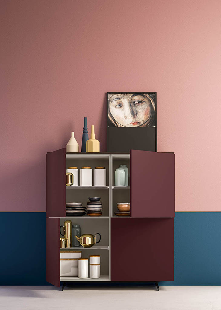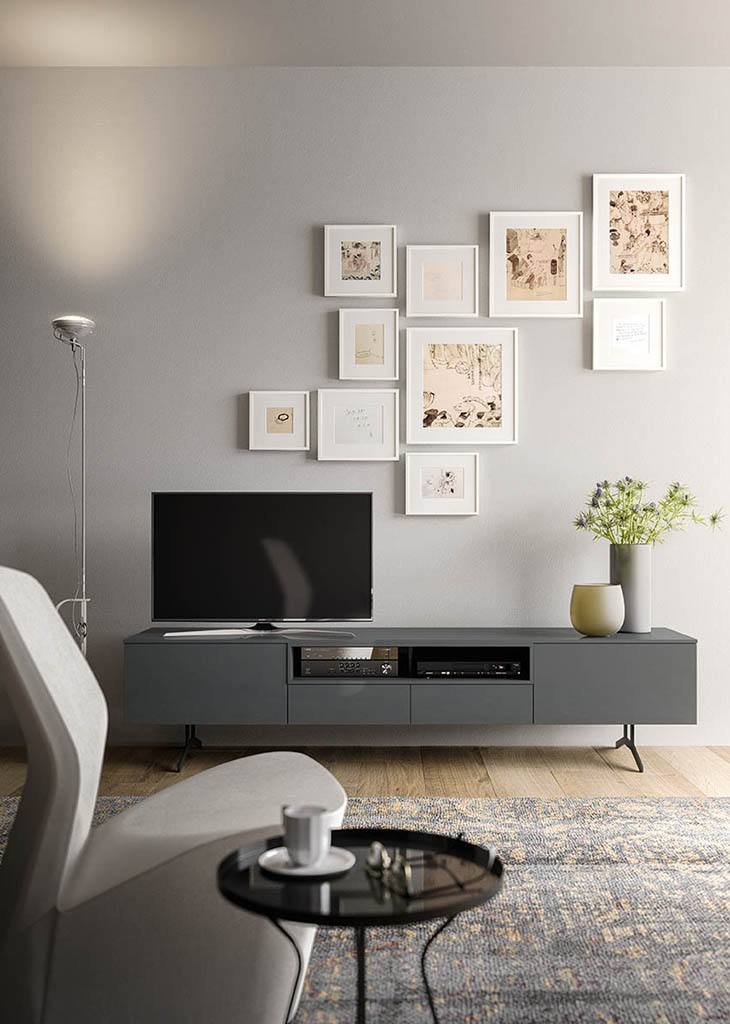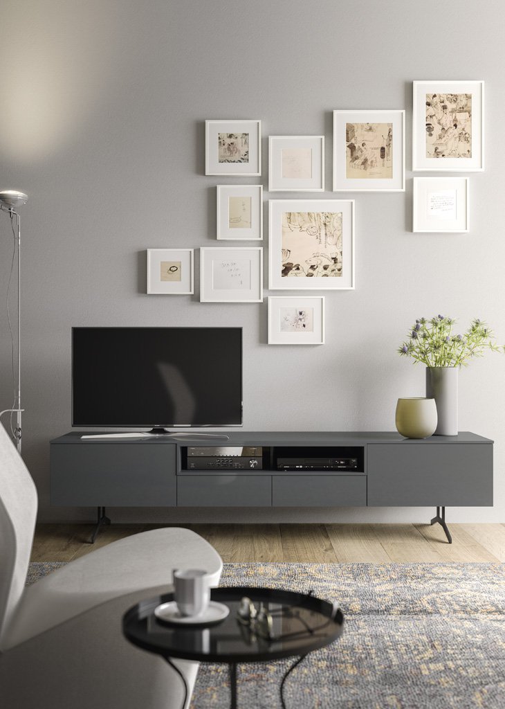 Nobel is available in the sideboard or cabinet version on painted metal feet. It offers a broad range of sizes and options for solutions with doors, drawers and large drawers. Choose your opening mechanism from one featuring push-pull or a leather knob. The design of the metal feet makes this a perfect match with the Oslo modern designer sofa.