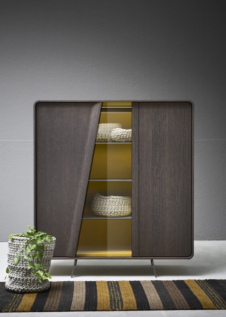 Musa is available as a sideboard, cabinet or display cabinet, and its main feature is the rounded shape of its carcass. It also stands out for the sloping cut of the doors that conceal the handle and continue in the lines of the painted metal feet. The interior can be lacquered and fitted – in the sideboard version – with a practical drawer unit.
