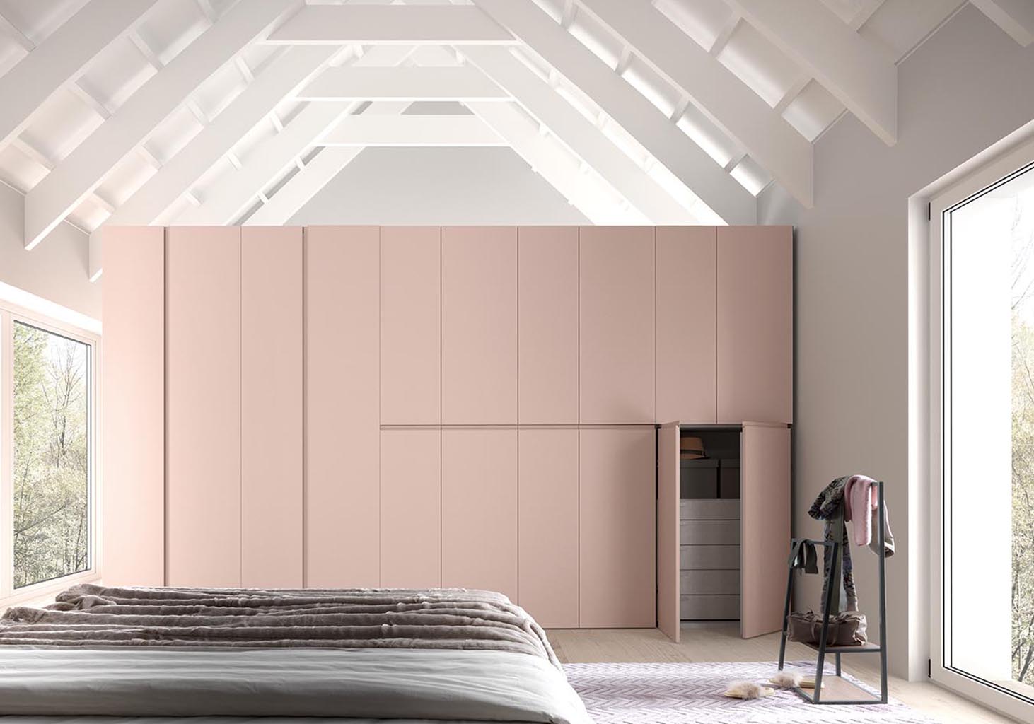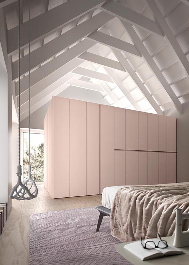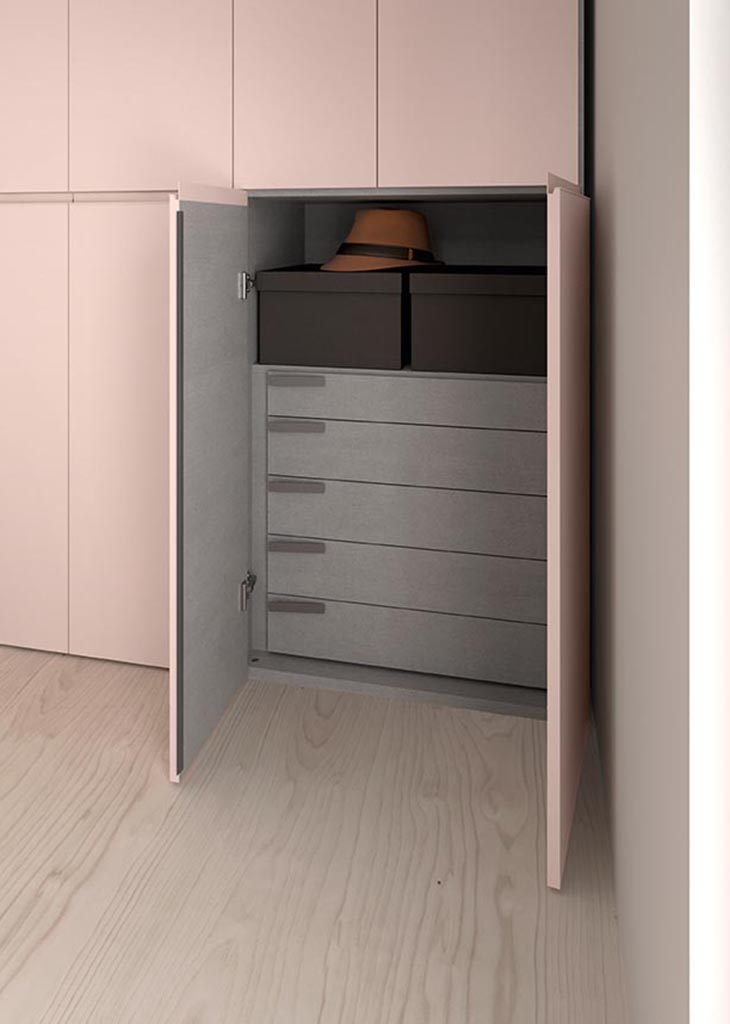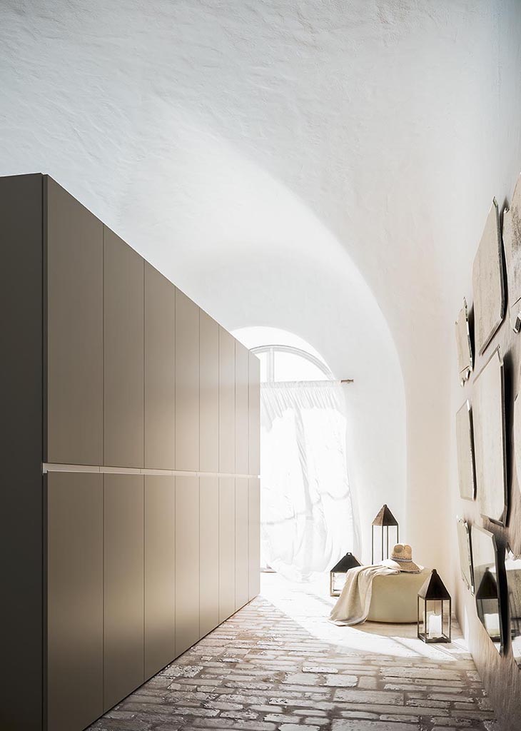 Orizon is a door designed for seasonal swinging wardrobes. This particular configuration features a horizontal handle profile that not only provides easy opening but also divides the door into two parts.