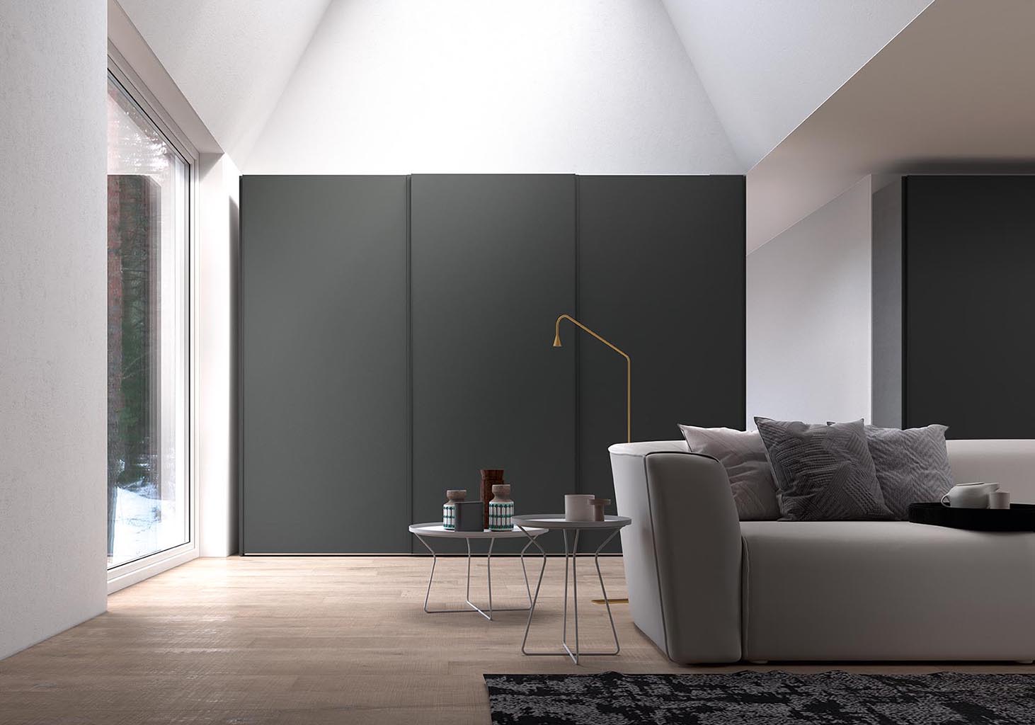 The design of the Go up wardrobes with sliding doors is characterised by a metal groove profile that runs all along the length of the door.