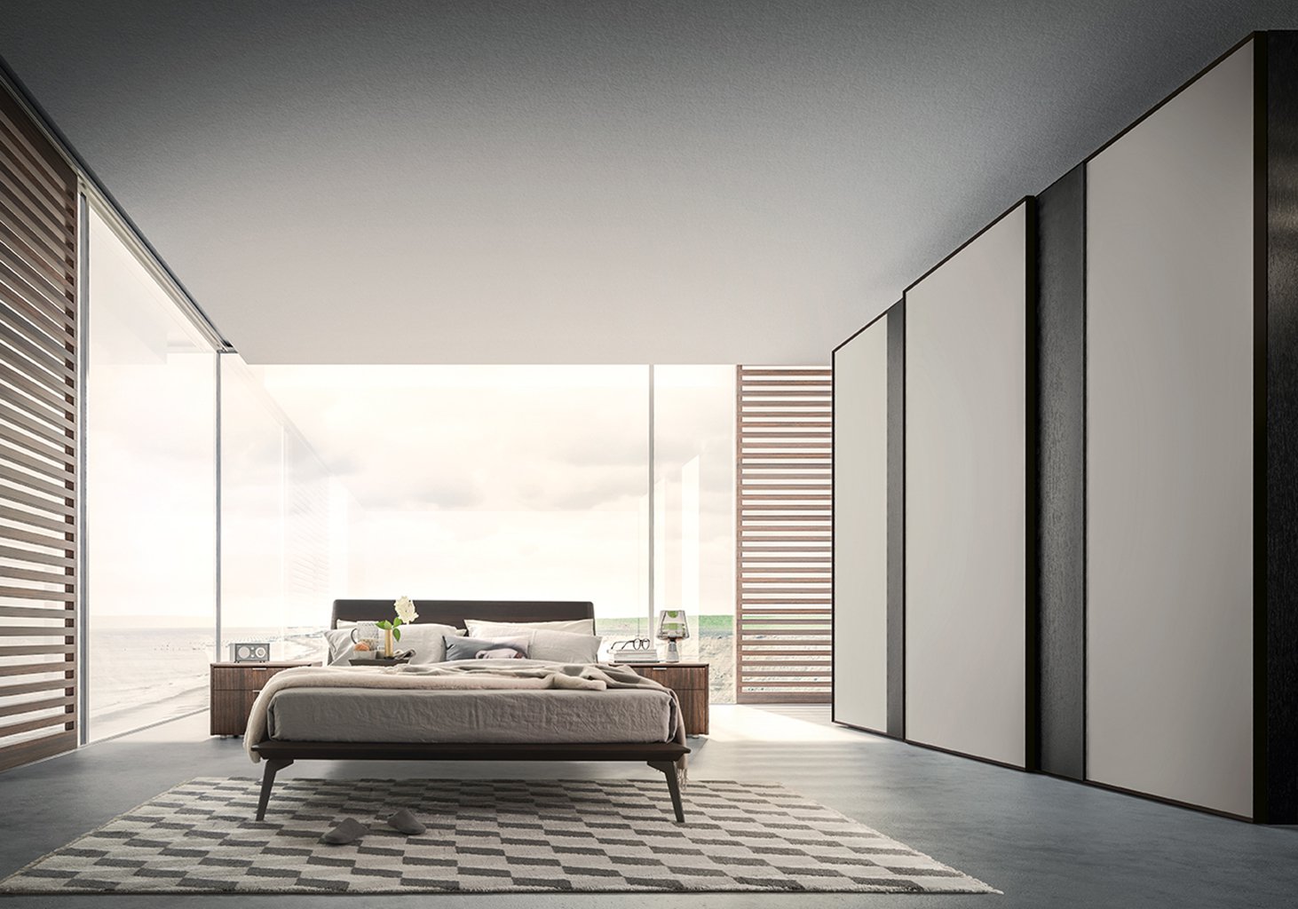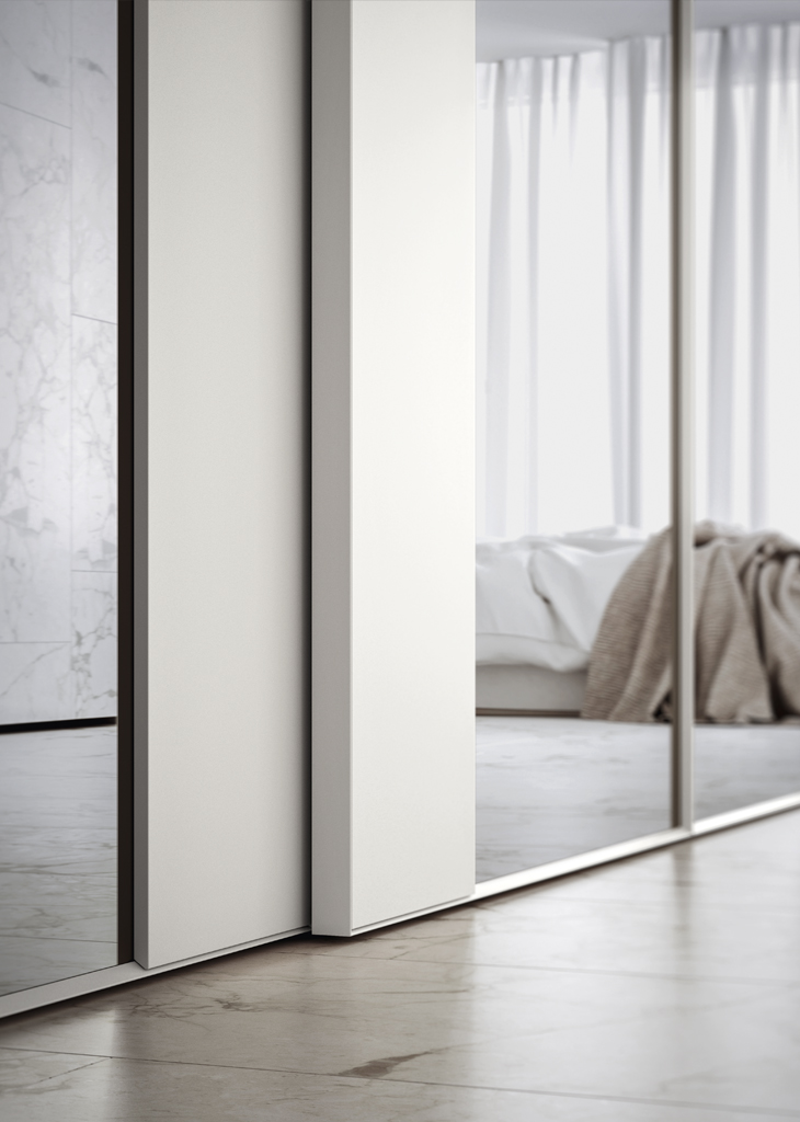 Frame is a wardrobe with sliding door that combines two contrasting finishes. Available in multiple finishes, even with silk-screened glass.