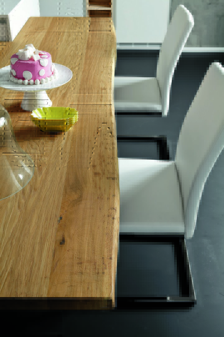 A 45 mm thick top in solid oak with uneven edges.