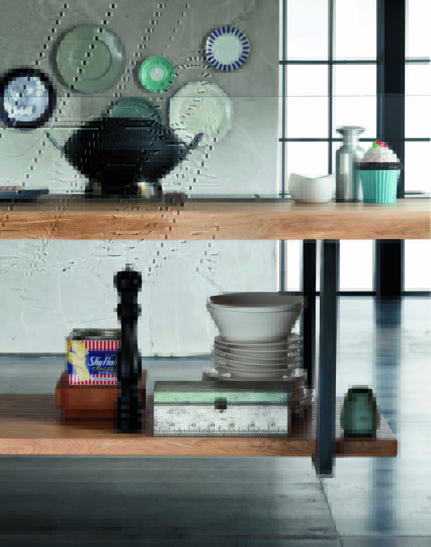 A 60 mm thick top in solid oak, with uneven edges, hand-planed surface, in Alaska finish.