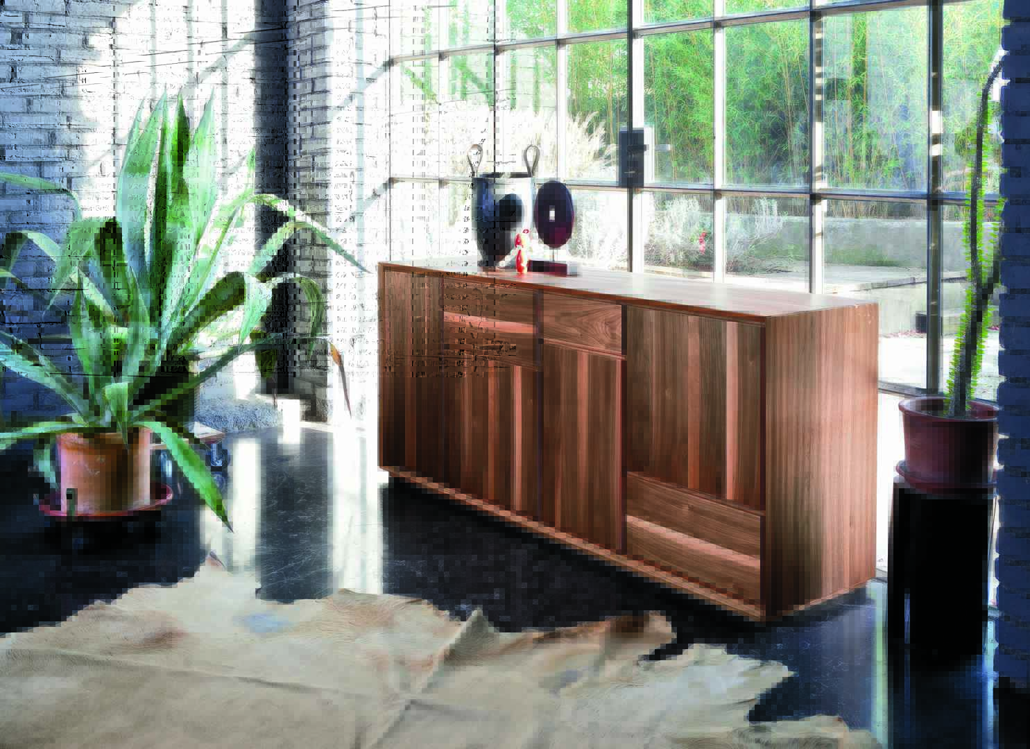 Sideboard in Natural walnut finish with various compartments of different sizes.