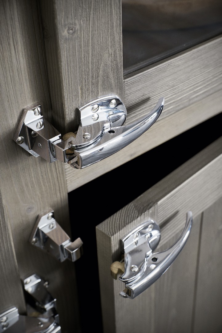 Easy unit in solid brushed spruce, Cenere finish, with 4 doors and chrome handles. The upper two doors are with transparent glass.