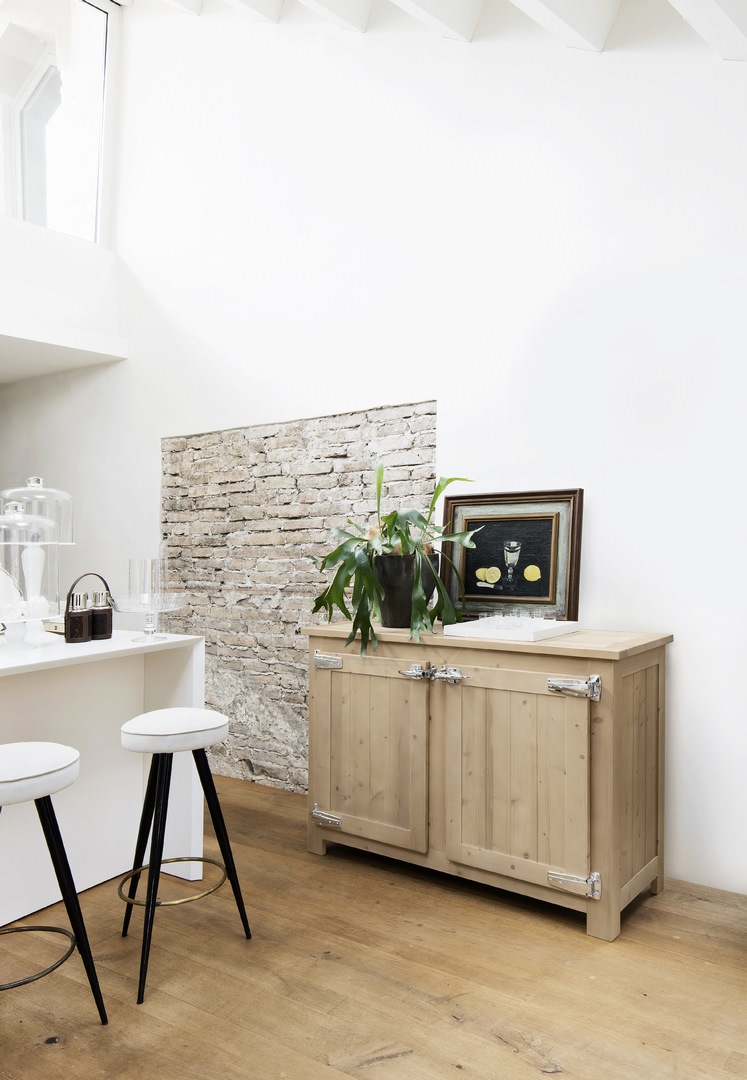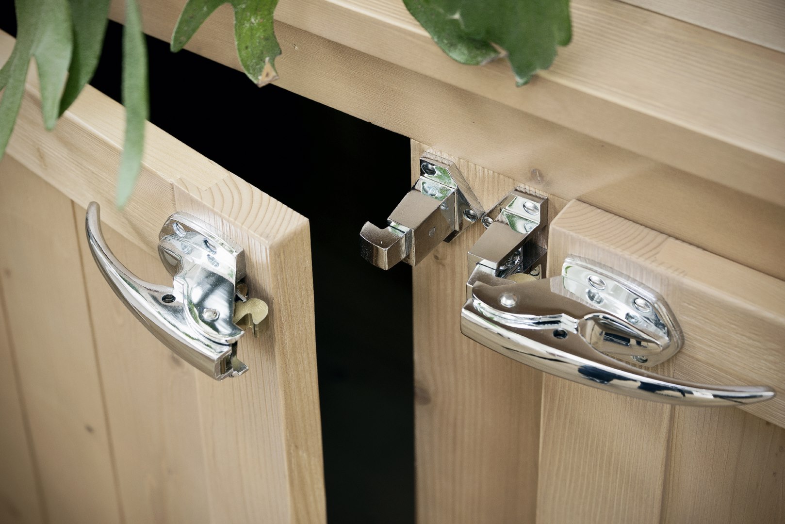 Easy unit in solid brushed spruce, Cappuccino finish, with two doors and chrome handles.