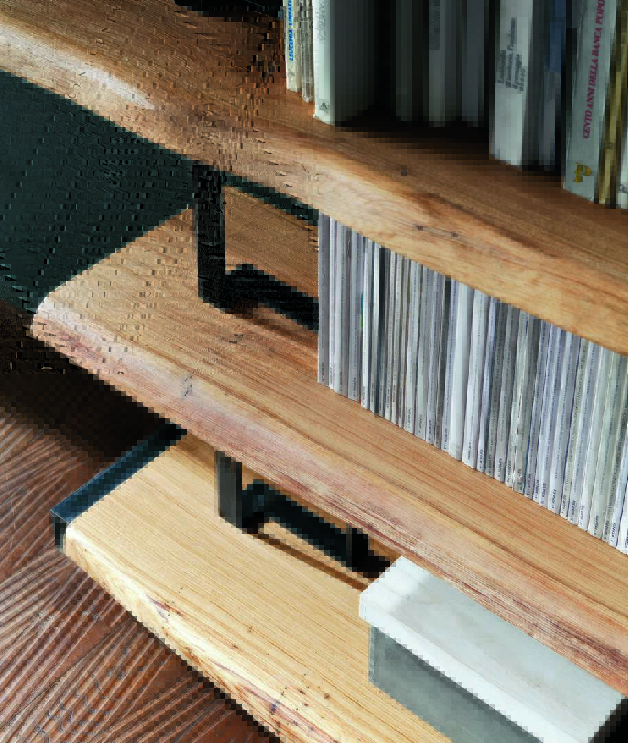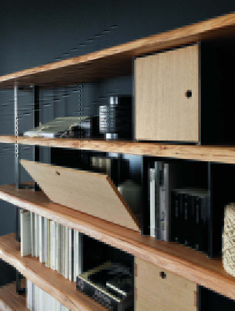 Eco.02 bookcase composes by six shelfs in solid oak, Alaska finish and structural bracket in Industry iron, an open iron unit with wooden door and wooden drawer.