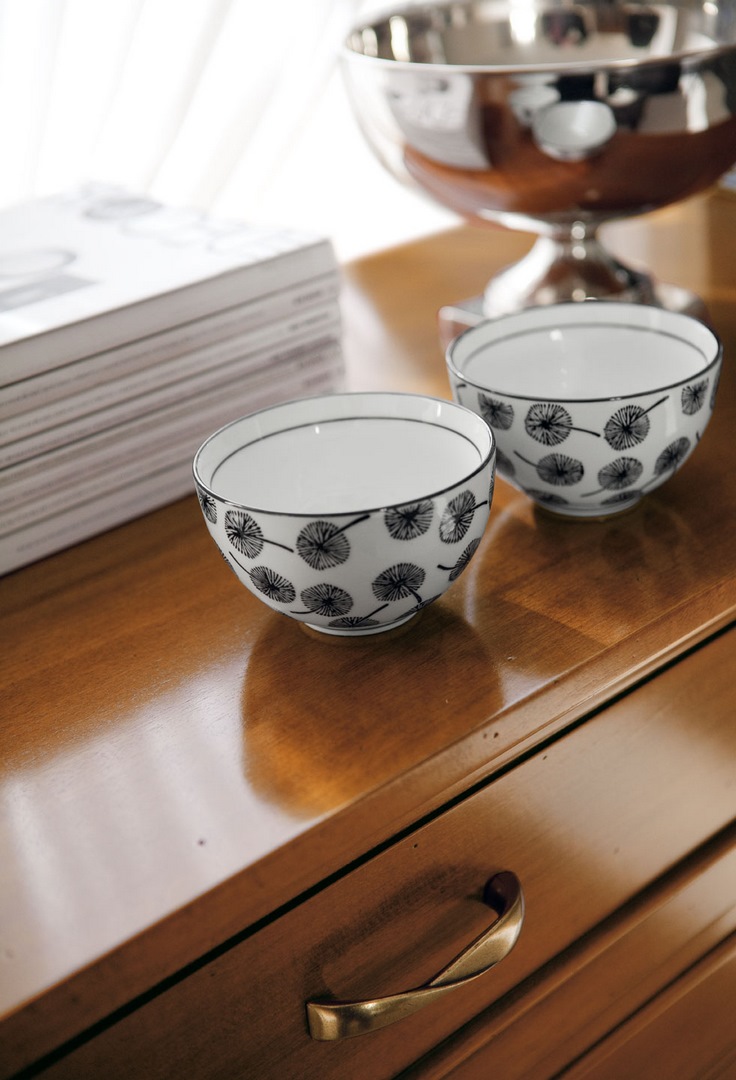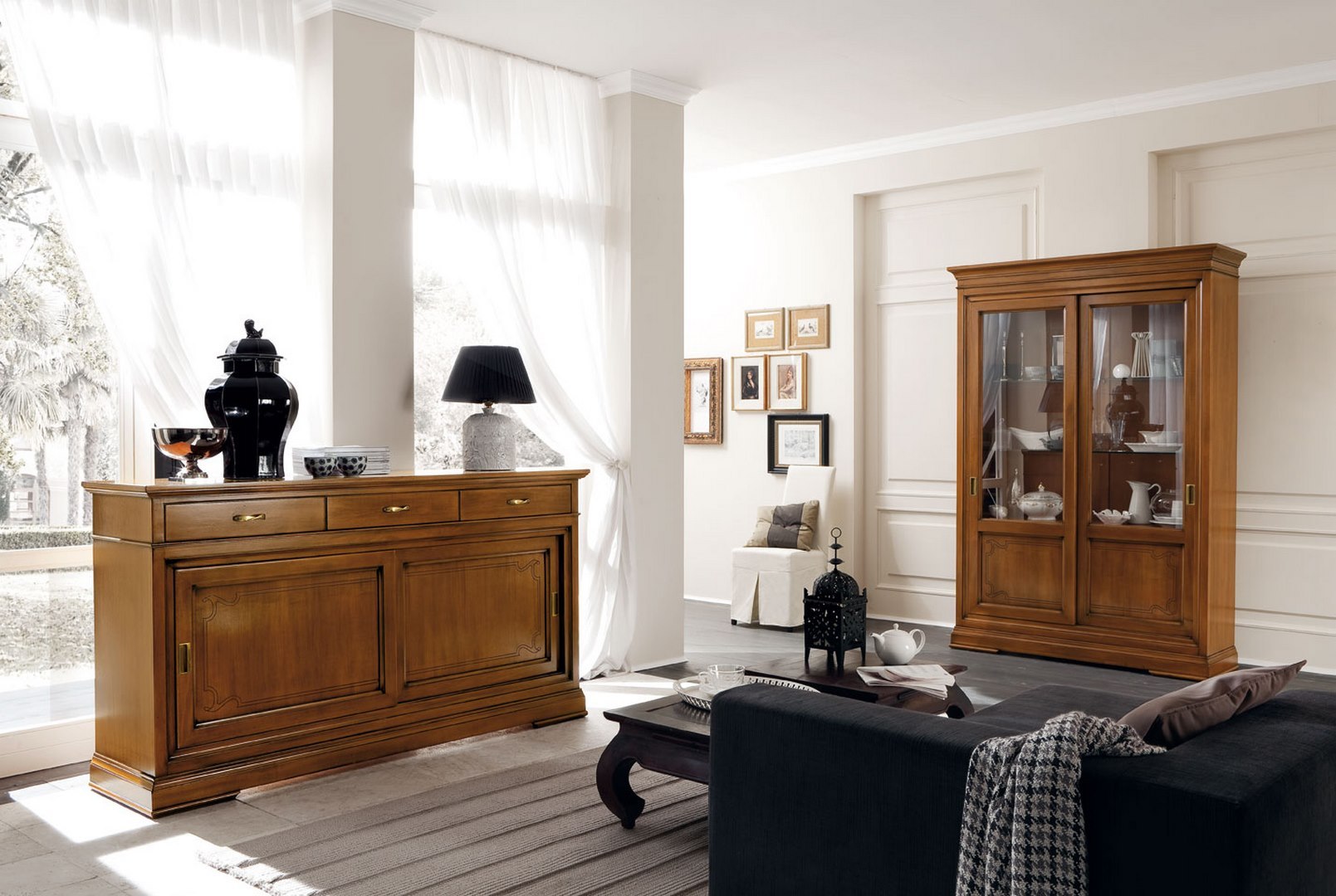 Sideboard in solid limewood and tanganyika walnut, with wooden shelf, three exterior drawers and two sliding doors; the doors are embellished with the characteristic Margherita collection engraving.
