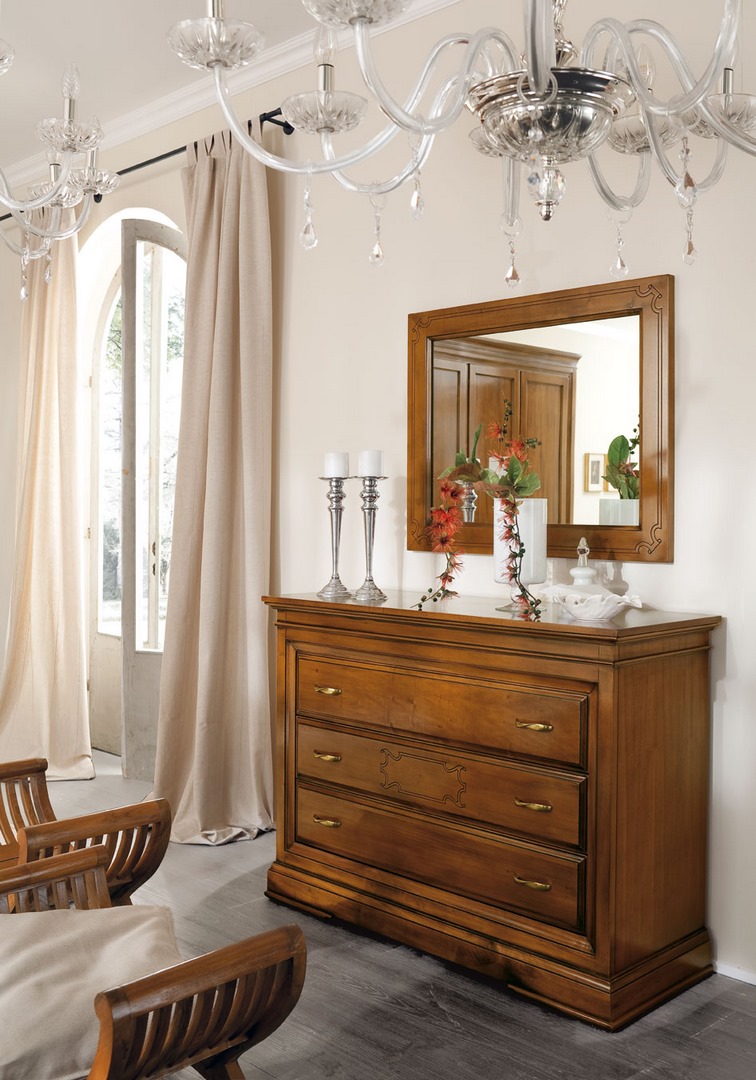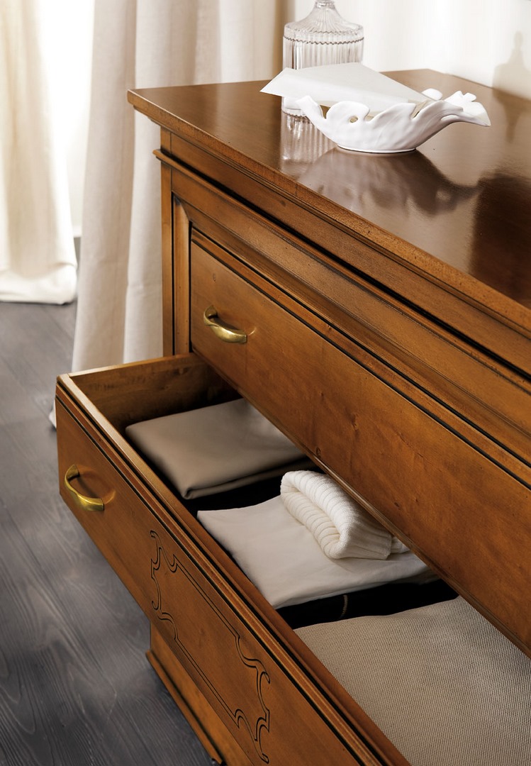 Dresser in limewood and tanganyika walnut, with three drawers and gilded handles.