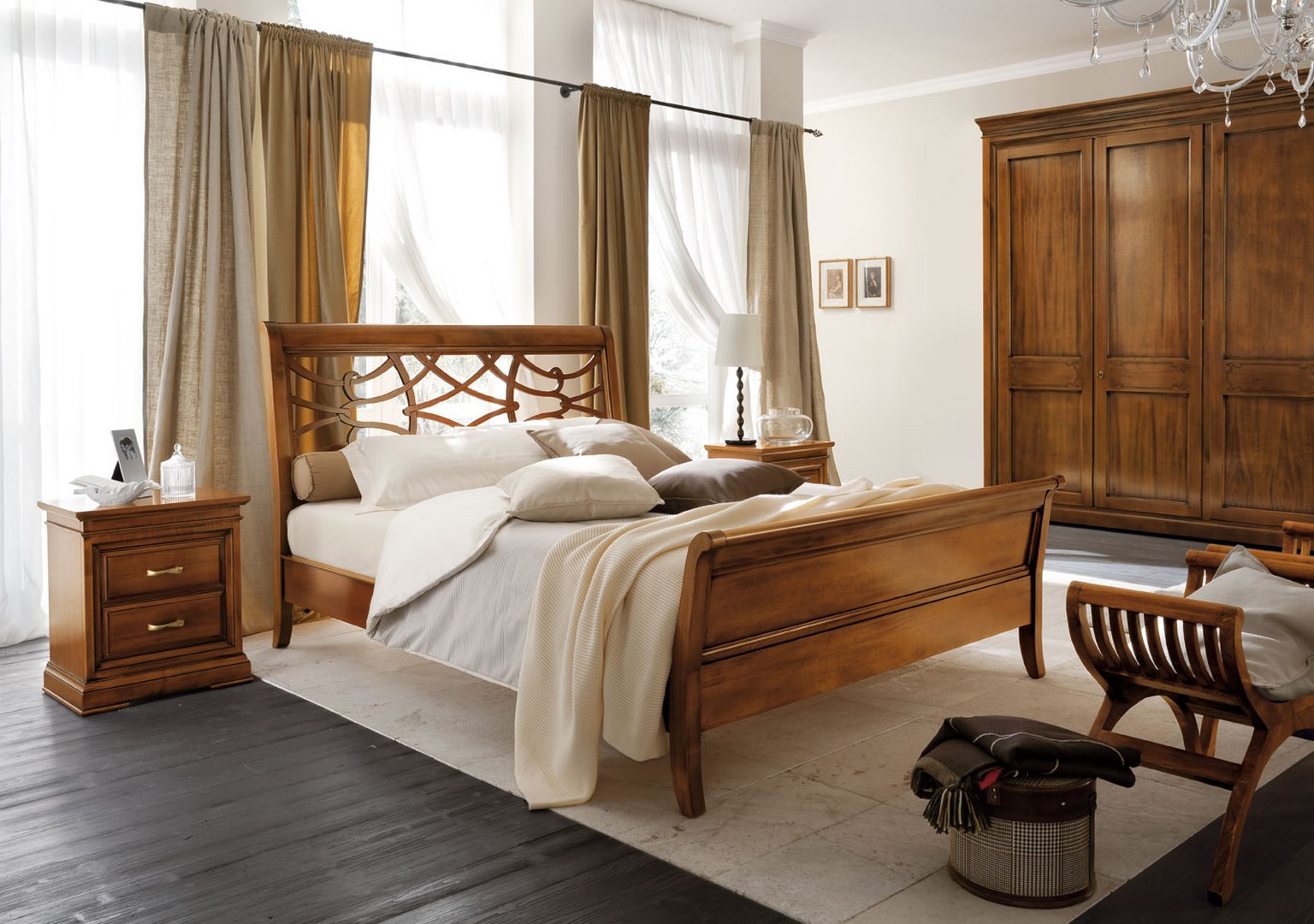 Accompanied by a wardrobe with four doors, 2-drawer bedside tables and a 3-drawer chest, all in limewood.