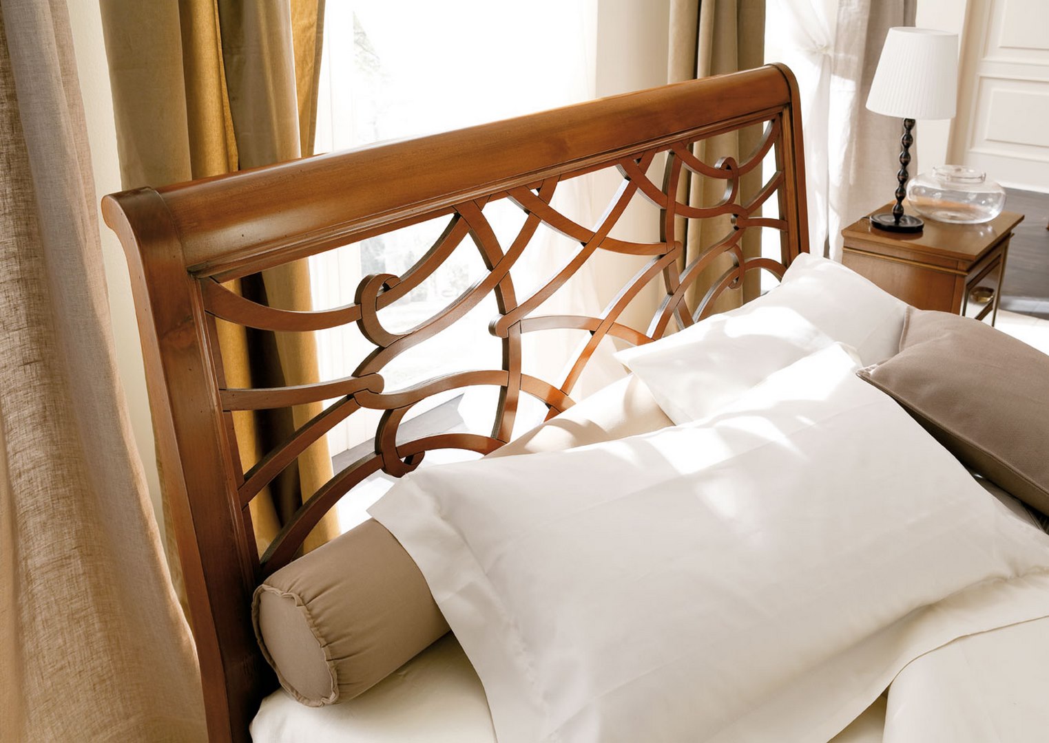 Bed in limewood, with openwork and footboard; also available with bed frame.