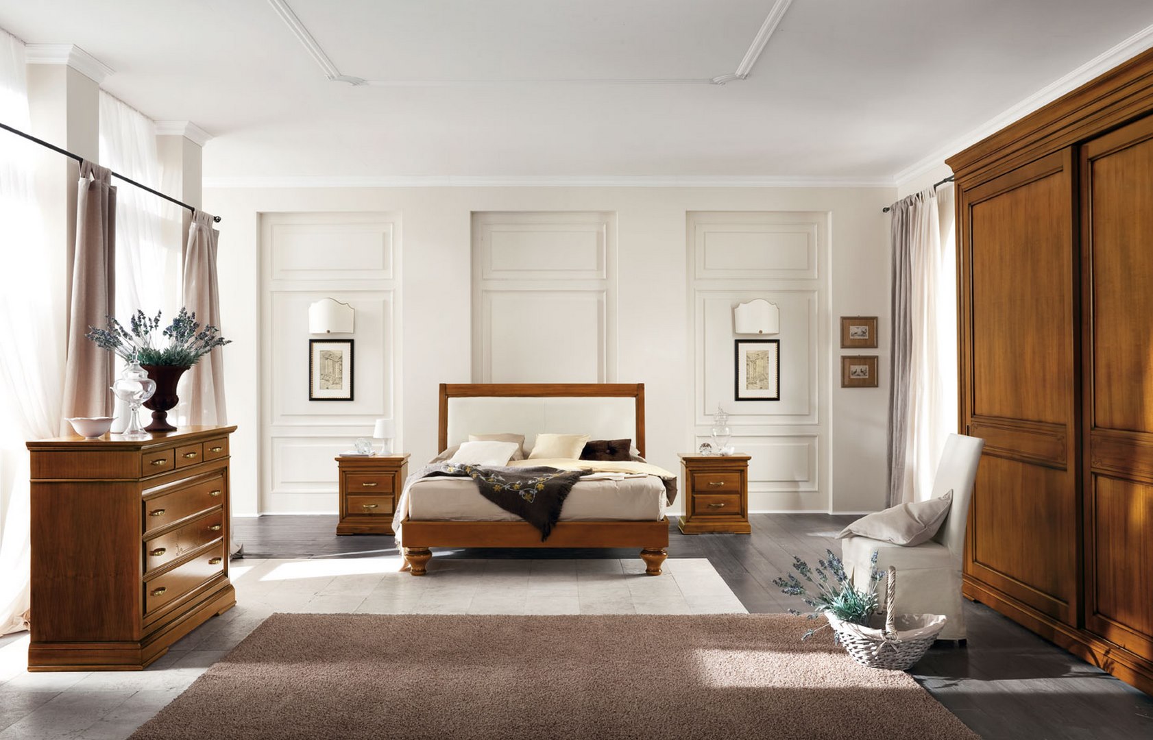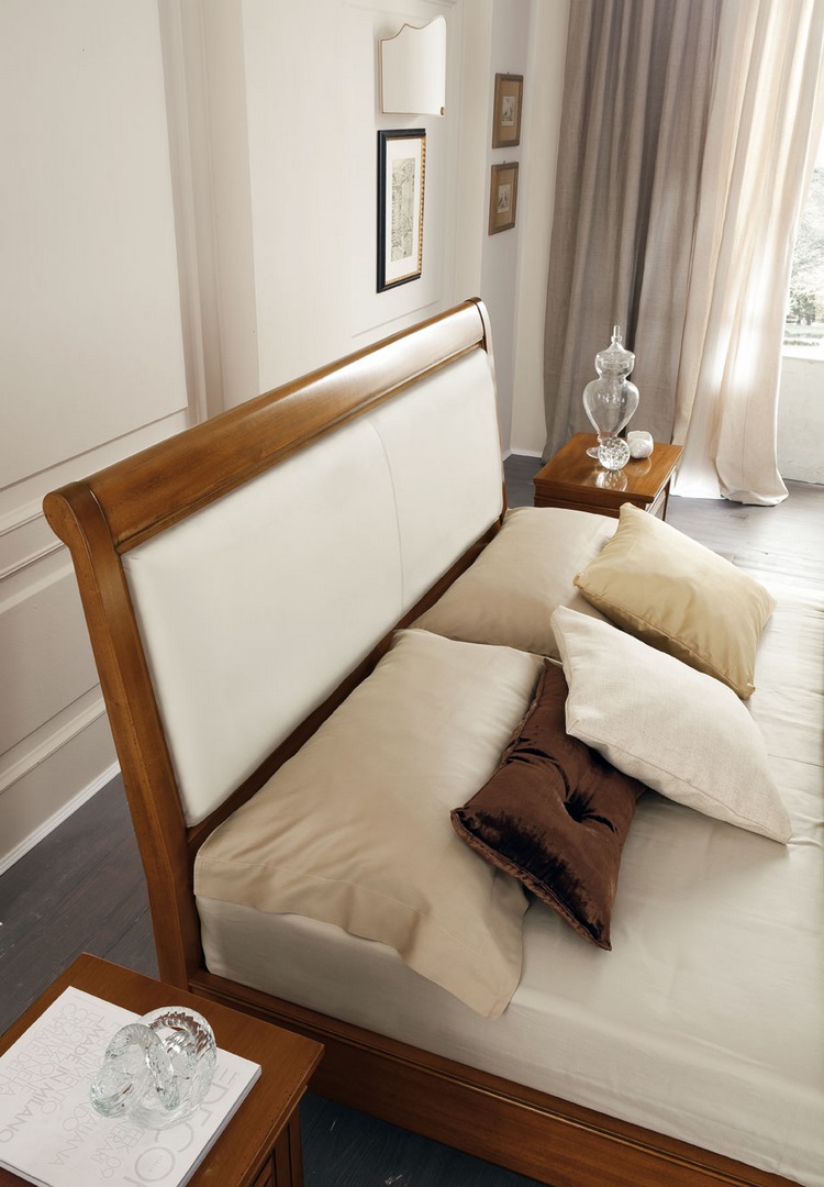 Bed in limewood, with upholstered headboard and bed frame; it is accompanied by a pair of bedside tables, again from the Margherita collection.