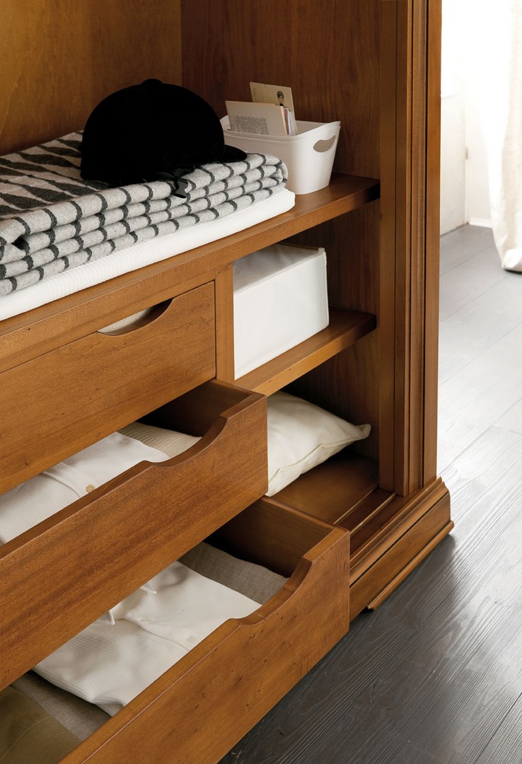 Wardrobe in limewood, with two sliding doors; fitted with interior set of drawers with top, shelf and three clothes rails.