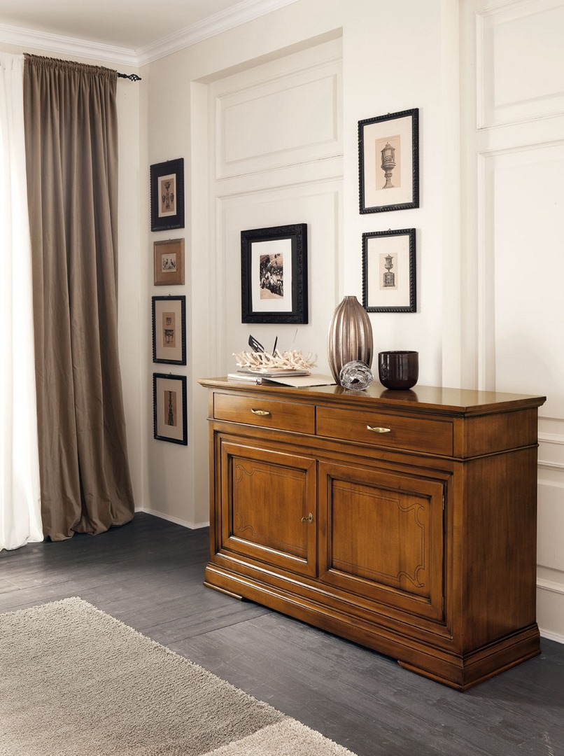 Sideboard in solid limewood, with wooden top, three exterior drawers and two hinged doors with lock; embellished with engraving on the doors and gilded handle.