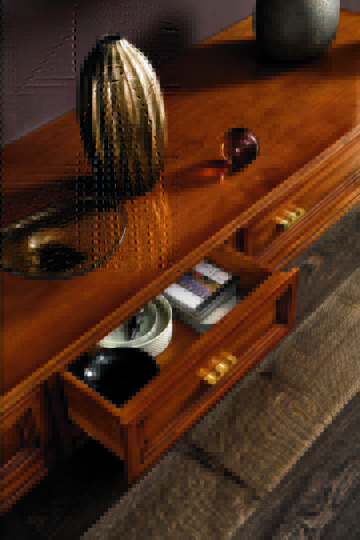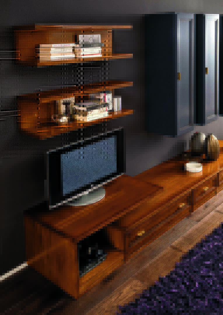 In the photo is presented a Modula composition made of three bases with one drawer each; one base a “C” and one shelf. It’s all in Essenza Noce finish.