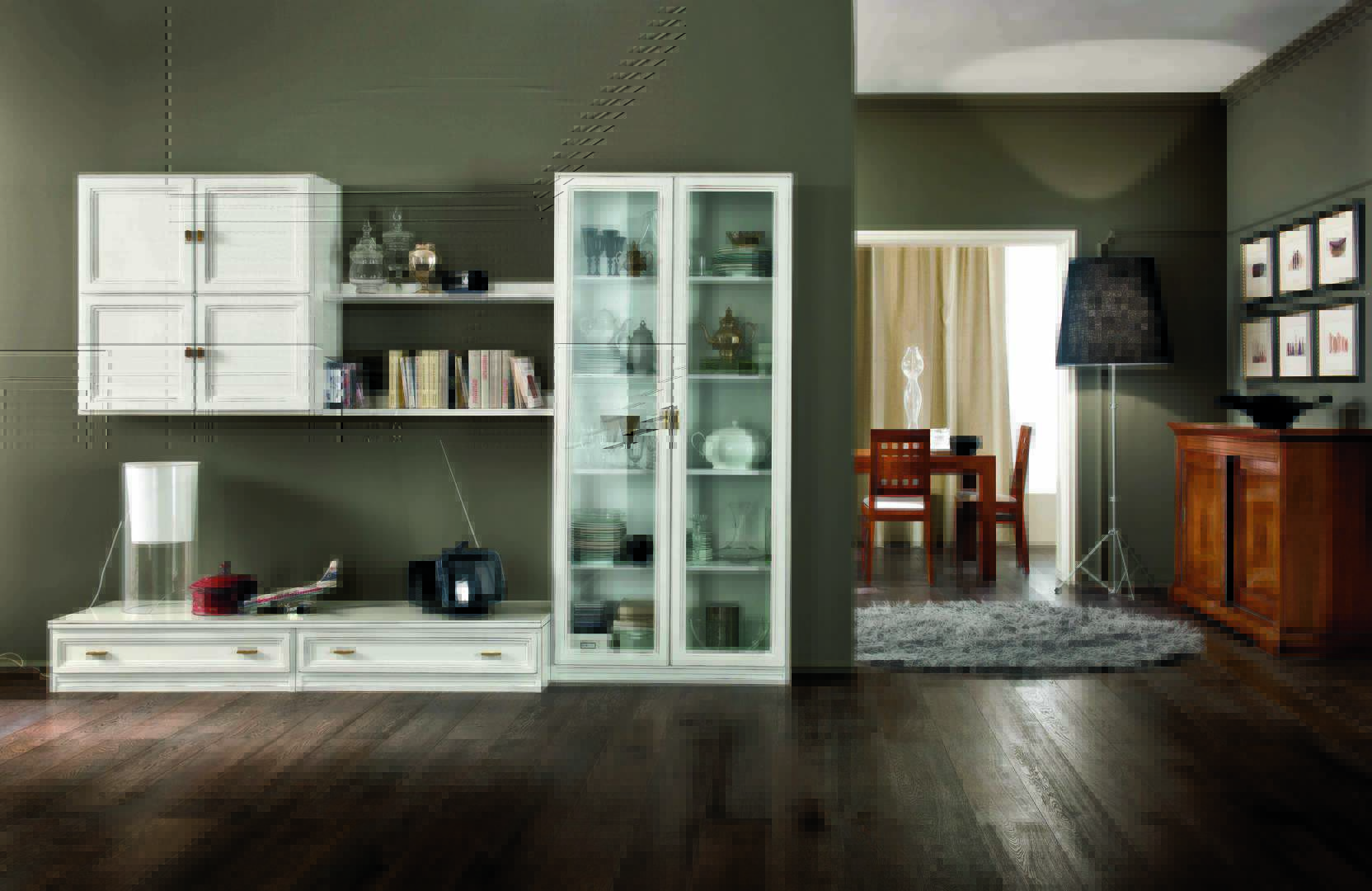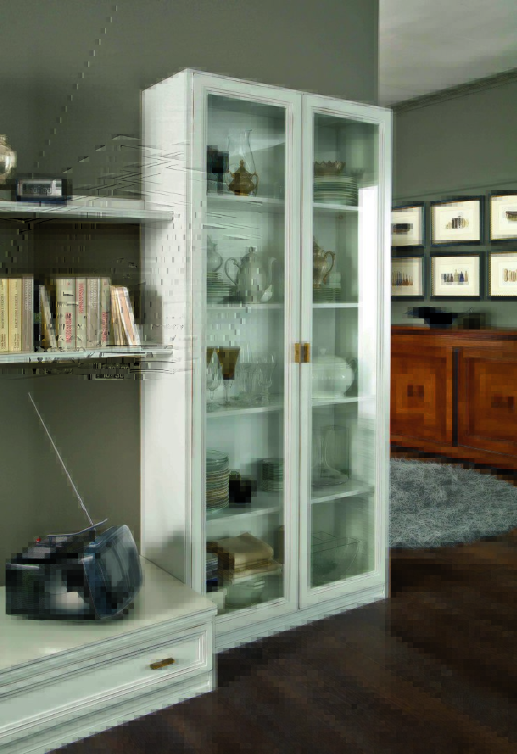 Modula composition MD005, here proposed in Bianco candido finish and made of: two bases with one drawer each, one tall unit with two glass doors, one wall unit with wooden doors and two “L” shelfs.