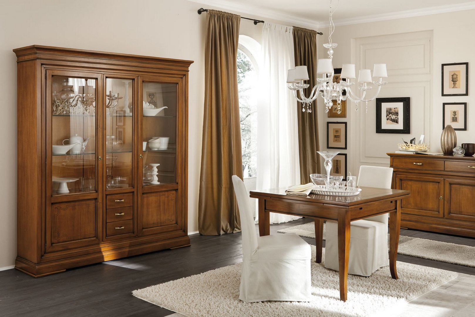 Accompanied by two Margherita chairs; in the background is a sideboard with three drawers and two glass-front hinged doors.