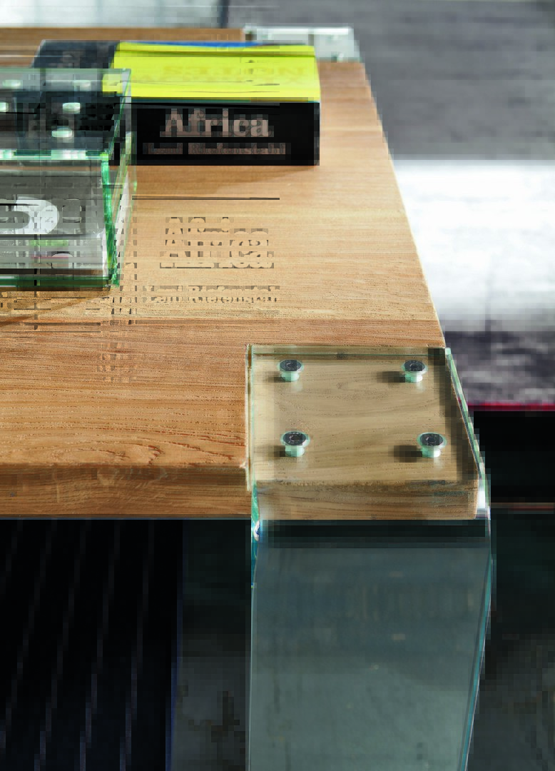 Siviglia table with 40-mm thick solid oak top and legs in 19-mm thick, non-tempered,hot bent, extra-light glass.