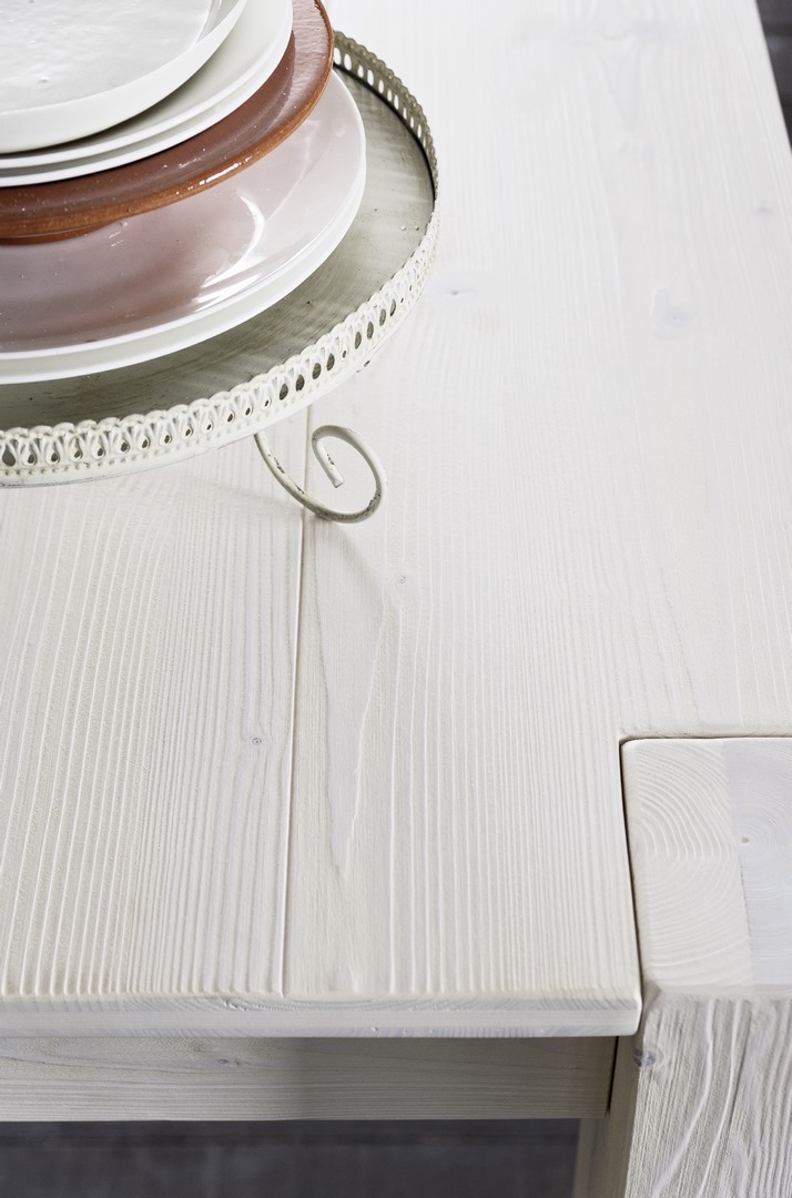 Stoccolma table in brushed sruce structure. Here presented in Bianco finish, with Nina chairs.
