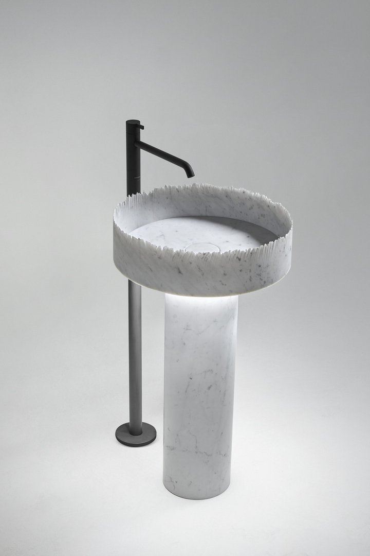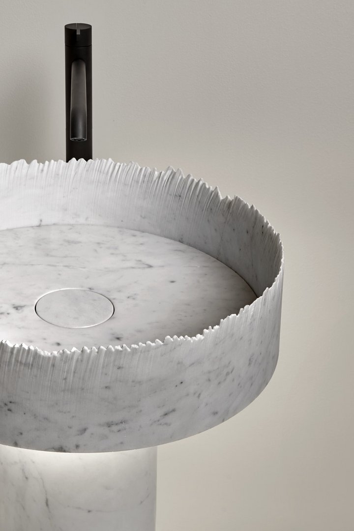 Un lembo di carta strappato, il profilo articolato di una catena montuosa, la gestualità di una pennellata verso l’alto, un tratto tremolante che rimanda al senso più profondo della frattura. Ancora una volta dall’incontro tra Paolo Ulian e antoniolupi nasce un’indagine sull’energia intrinseca della materia, sulla forza racchiusa nel marmo, sulla gestualità dell’uomo e sulle potenzialità tecnologiche della macchina. Flow è il lavabo freestanding il cui bordo del bacino è costituito da una linea spezzata, un perimetro frastagliato e sottilissimo, un profilo inedito che lascia spazio a immagini e riferimenti diversi, diventa strumento per l’interpretazione personale dell’area lavabo.