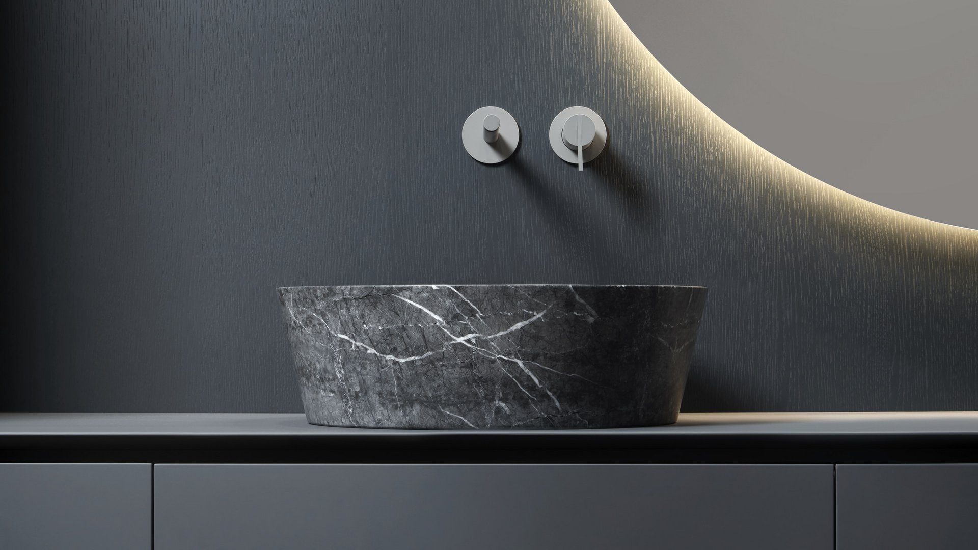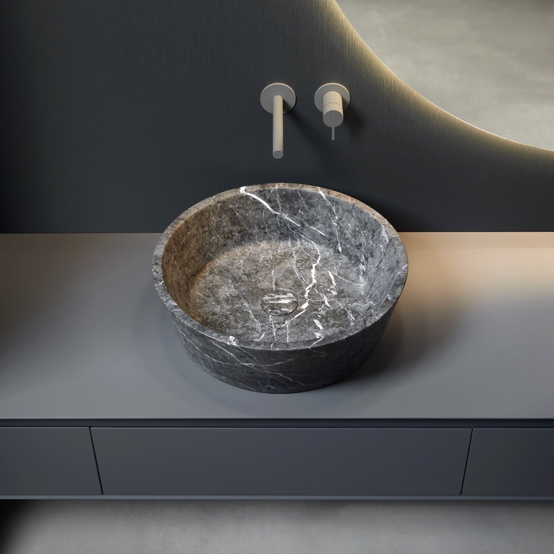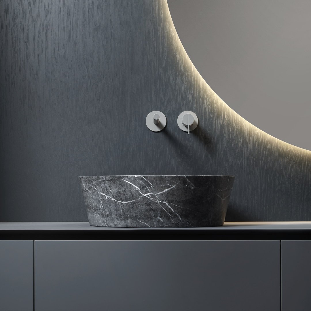 Una forma geometrica perfetta, un anello dai lati inclinati e dai bordi di forte spessore. Un catino che trasmette la solidità della pietra attraverso un immagine semplice e assoluta Pila è un lavabo tondo sopra piano dall’immagine essenziale ma allo stesso tempo importante. Una carattere moderno dettato dalle line nette che accompagnano la forma circolare.