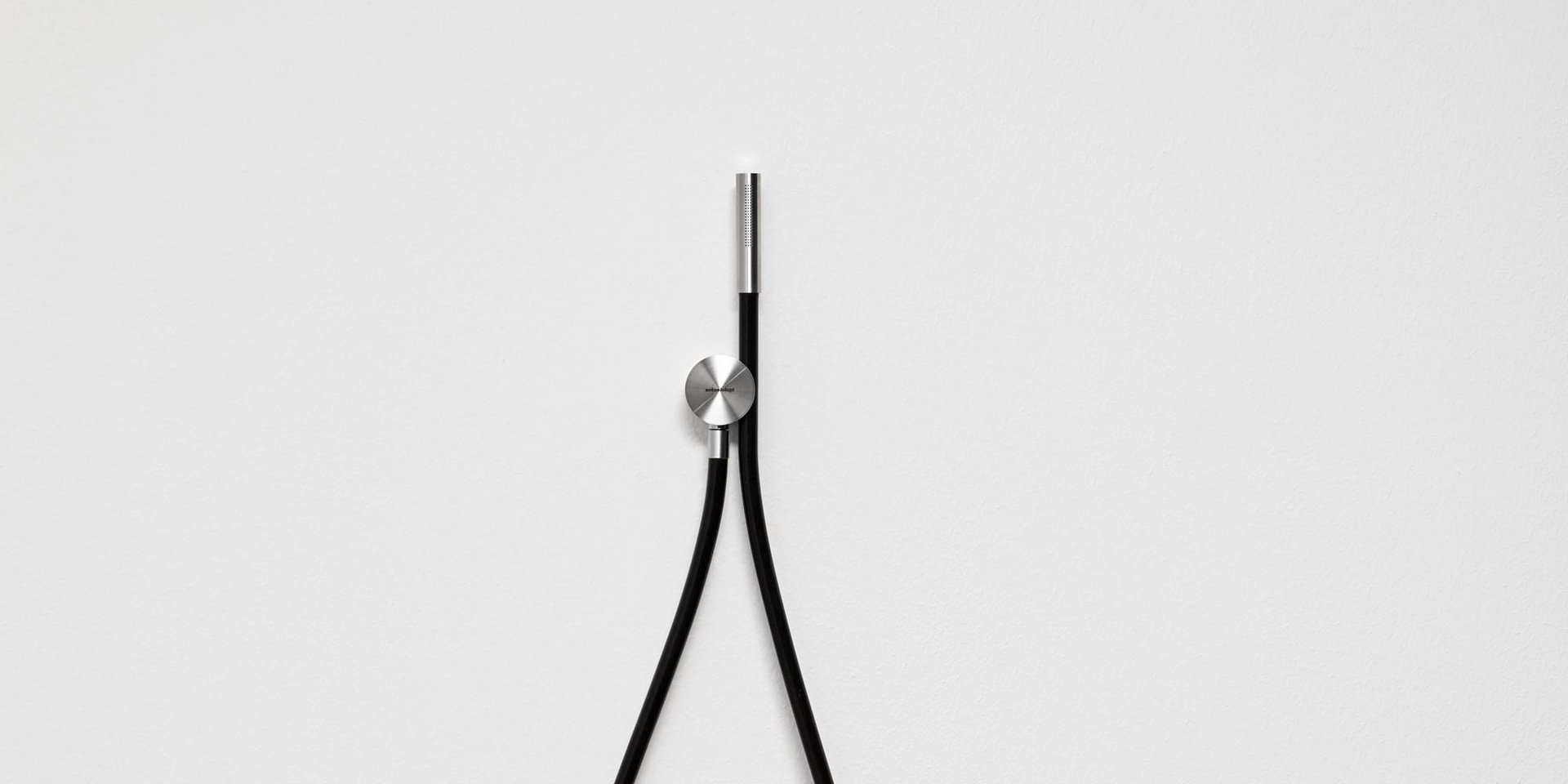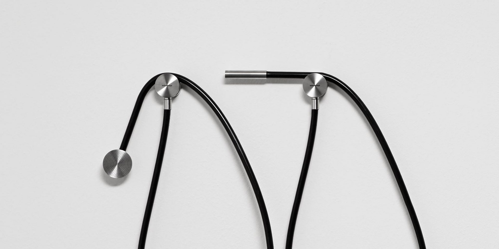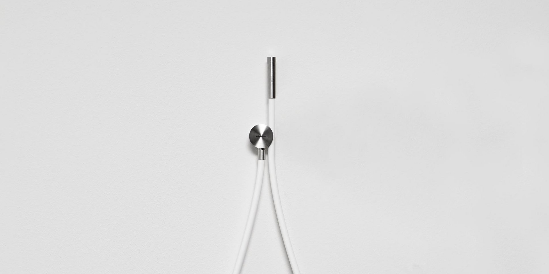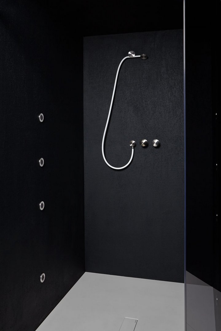 Hand shower in satin or polished stainless steel or graphite finish complete with wall support and water outlet, flexible hose 150 cm in silicone colored white, black or grey.
