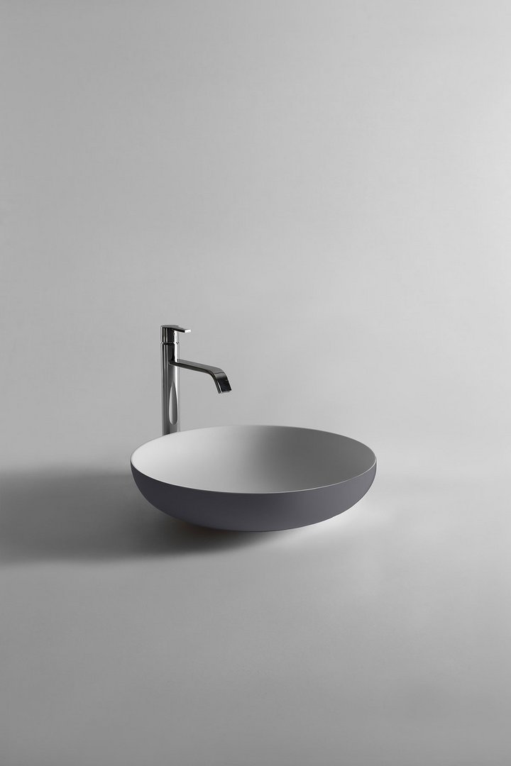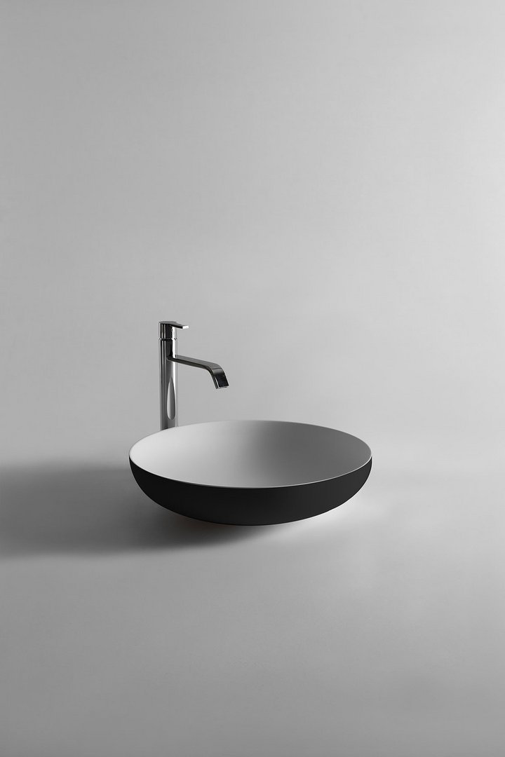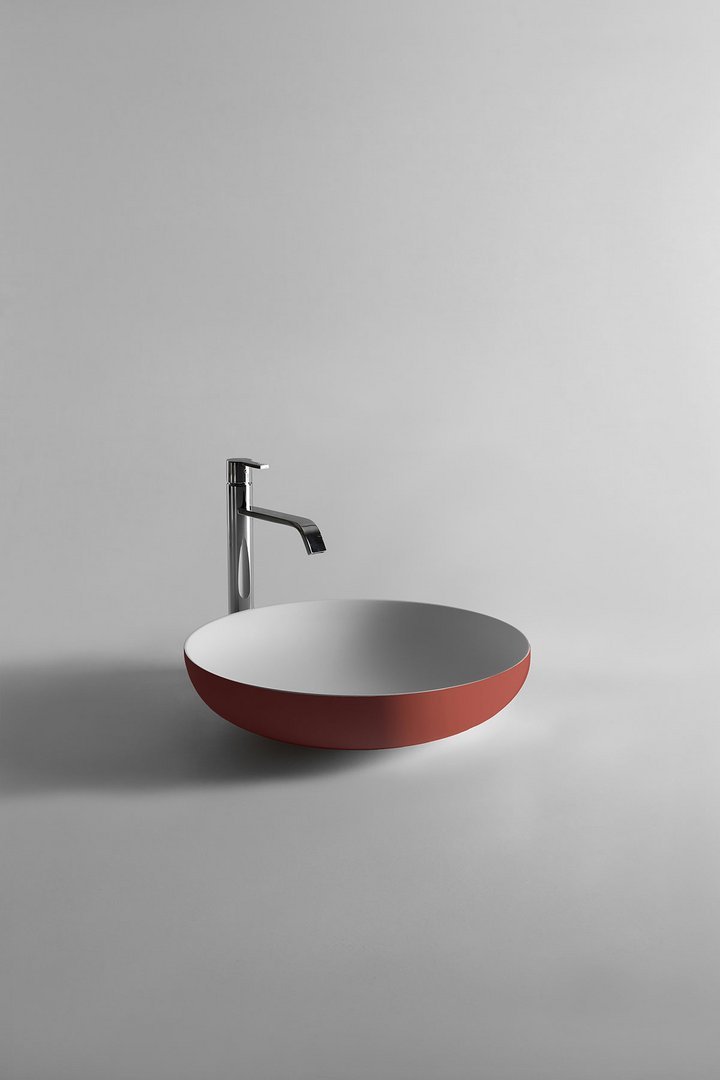 Round top mount Flumood? sink, complete with drain pipe fitting and open plug, that can be lacquered externally.