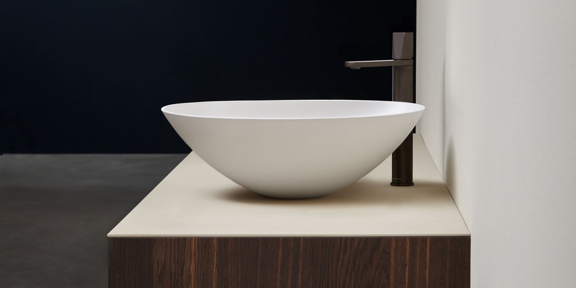Round top mount Flumood, can be externally lacquered in all colors of our collection or Ceramilux sink complete with drain pipe fitting and open plug.