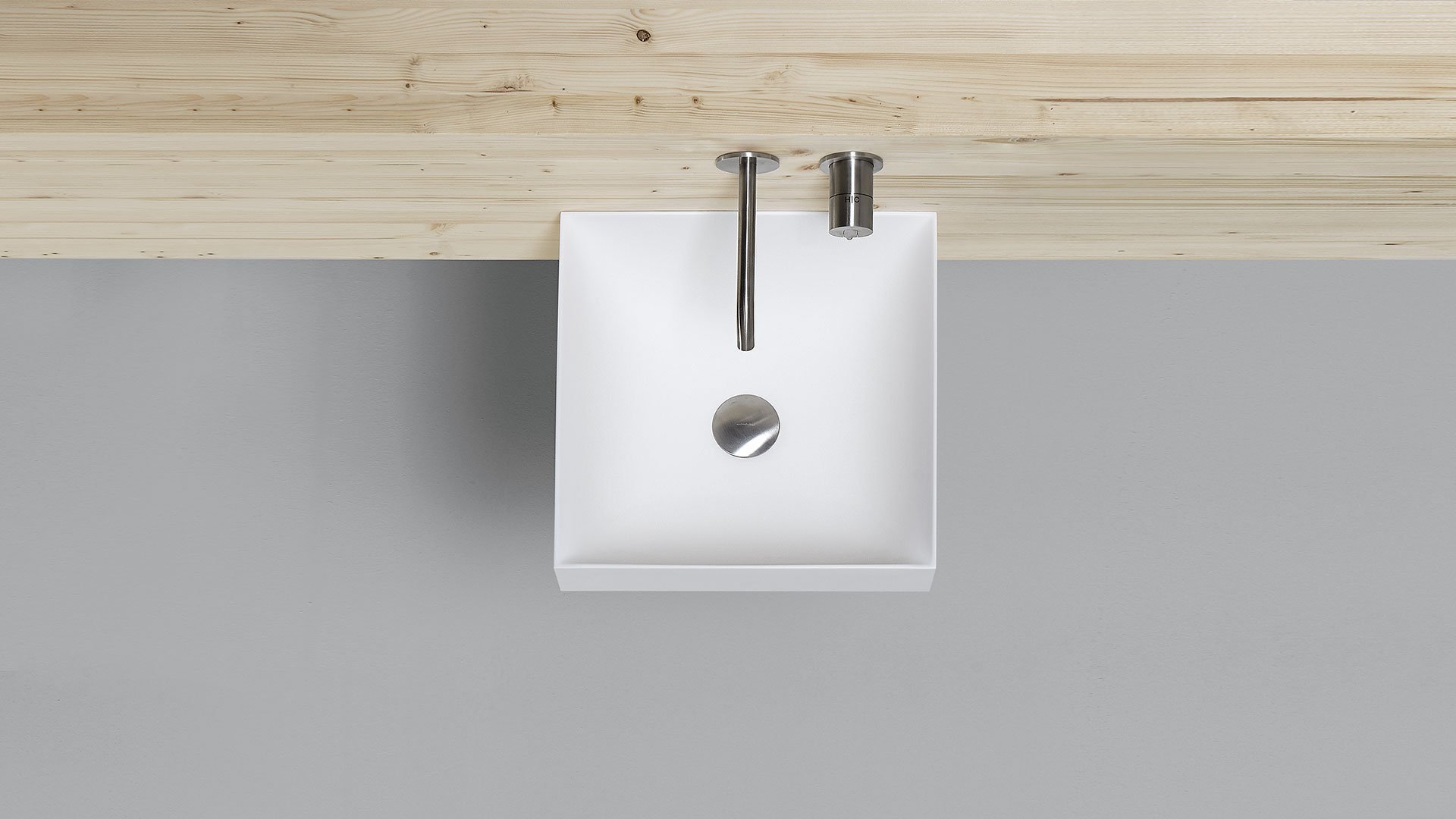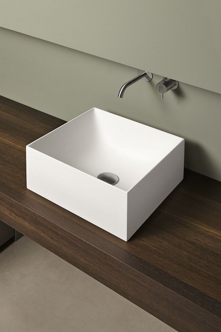 Square top or wall mount Flumood sink, complete with drain pipe fitting and open plug. Can be lacquered externally.